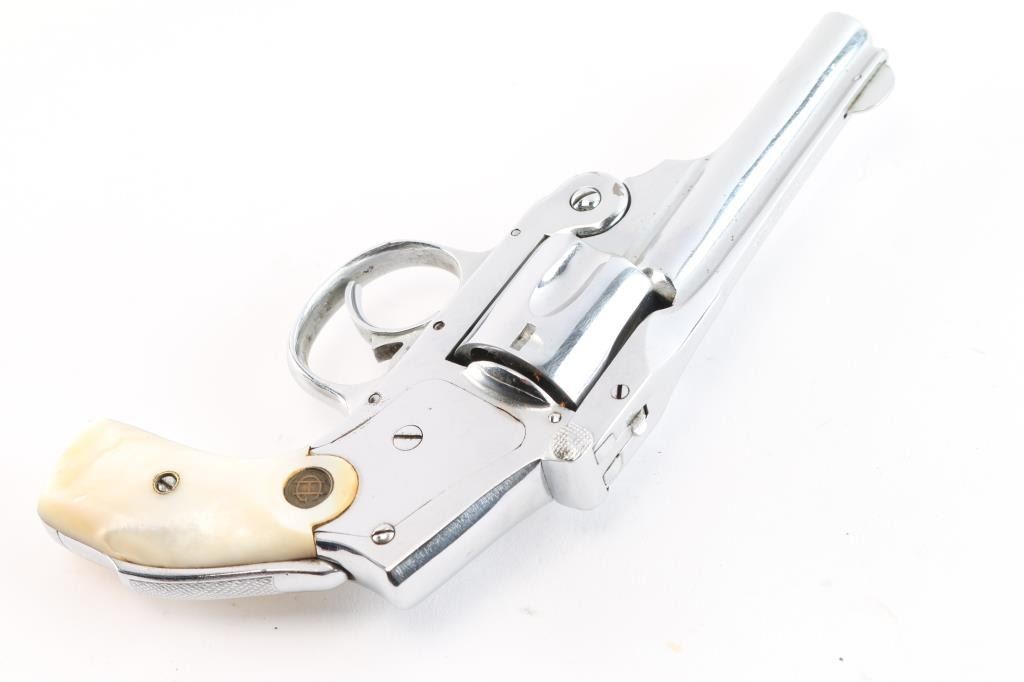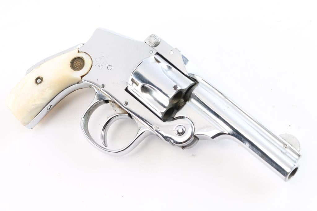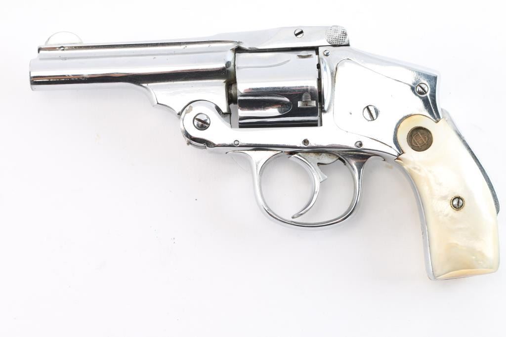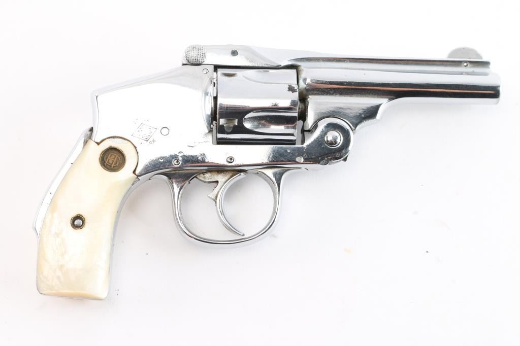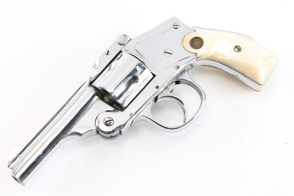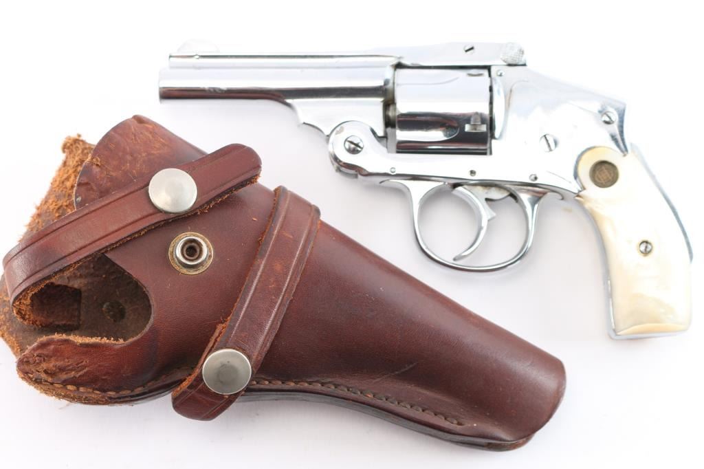 Vintage American made double action only revolver chambered for the older 38 S&W cartridge, not to be confused with the longer "special" cartridge. Features nickel or chrome refinish, smooth grips (appear to be mother of pearl) with "HG" medallions, 3.25" barrel, grip safety. Internal hammer, five shot cylinder. Bore is poor to fair condition with traces of rifling. Finish is very good, with tool marks visible, no observed peeling or flaking, losses at edges and corners. Sideplate has good fit. Action is smooth with good lock-up. Cylinder turns freely when trigger is released. Extractor does not snap back at full extension, does withdraw as action is closed. Includes a fair to good condition Hunter brand leather holster, not made for this model but does appear functional.