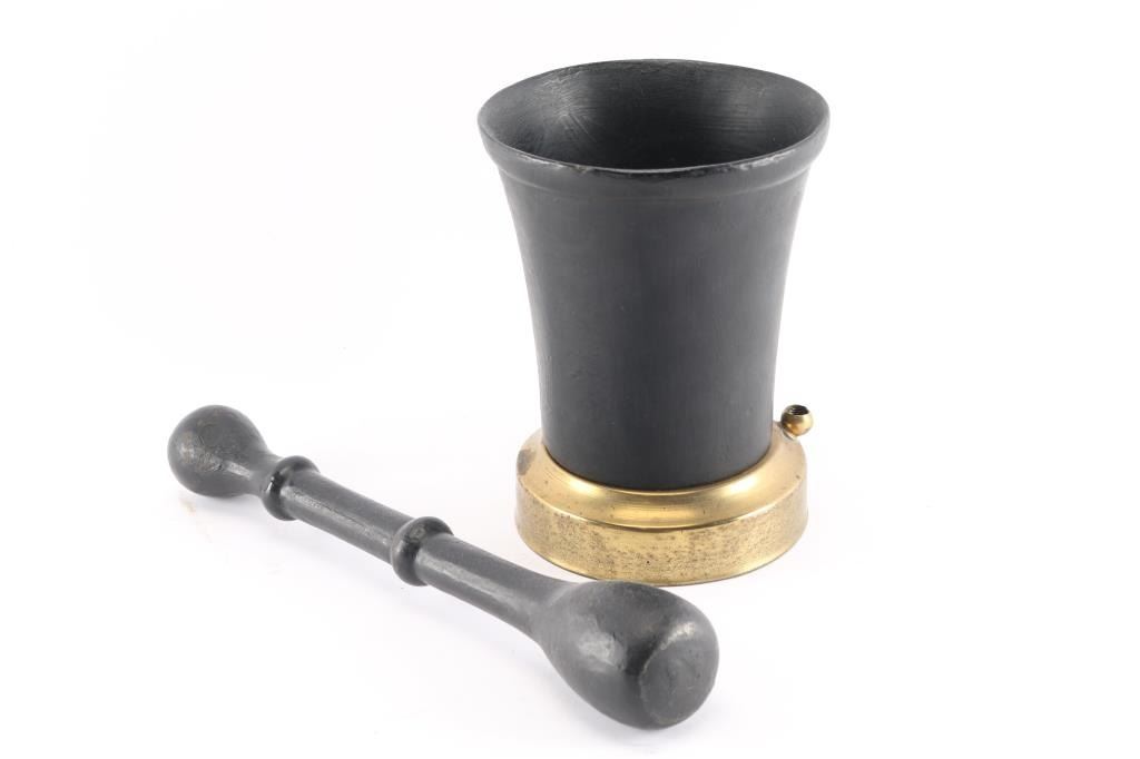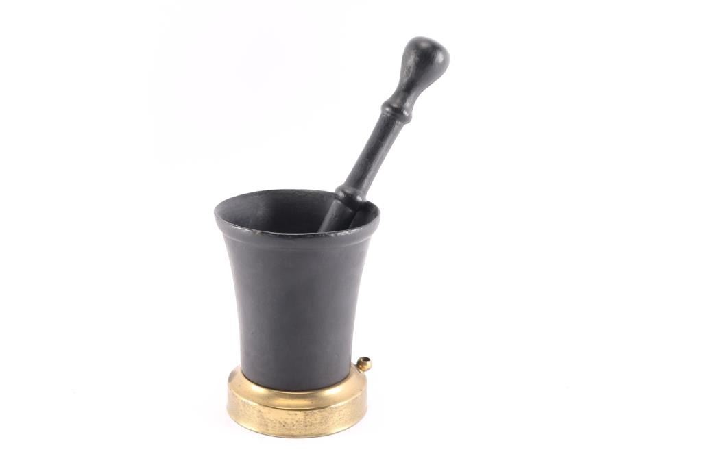 Acquired for the 1949 city centennial from home of 1900s pharmacist. Made of black cast iron set on a brass base. Mortar measures 7" tall with base and 15 1/2" circumference. Pestle measures 11" tall and 6 1/2" at widest part. Weighs 9 lbs.