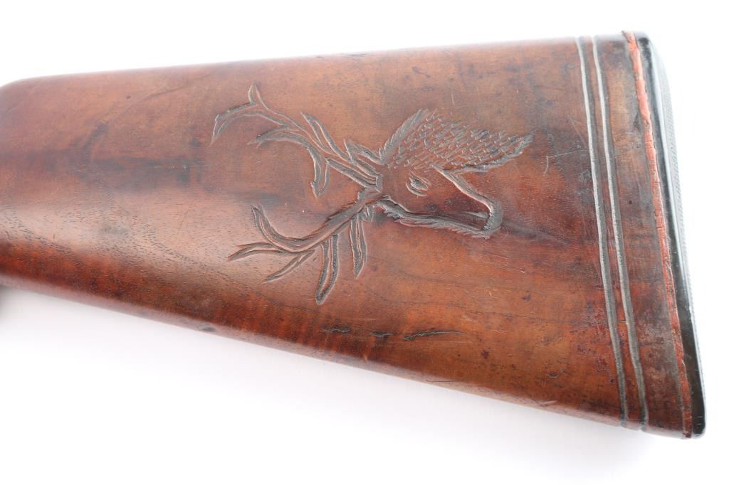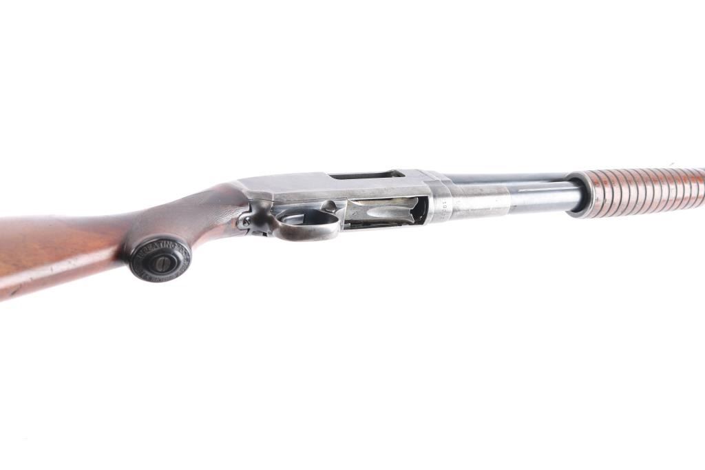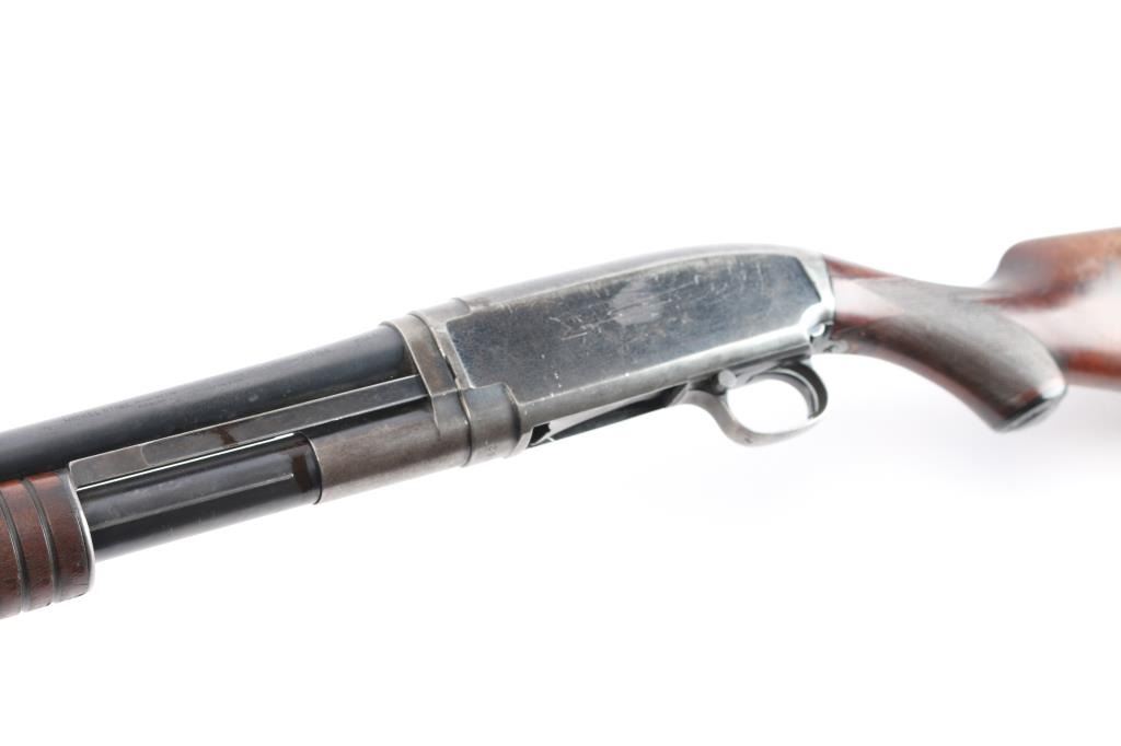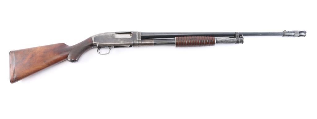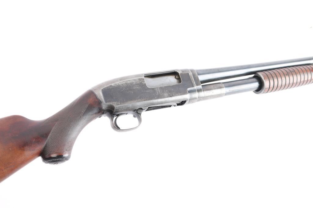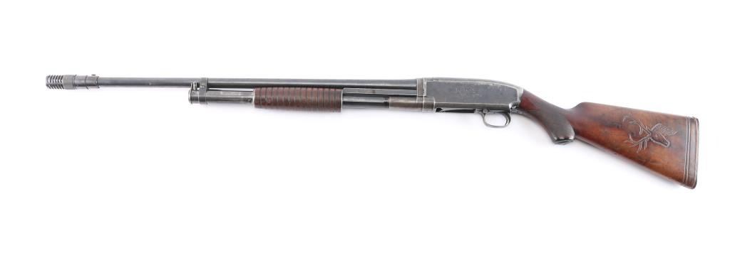 Vintage slide action repeating shotgun chambered for 2 3/4” 20 gauge shells. Manufactured in New Haven, CT circa 1912, first year of manufacture. Features a blued finish, 24” plain take-down barrel with adjustable Poly-Choke installed, marked “FULL”, brass bead front sight, 6 round tube magazine, smooth curved trigger, cross-bolt safety, polished bolt, polished carrier, single action bar, grooved walnut slide handle and smooth semi-pistol grip shoulder stock with checkered plastic buttplate & factory grip cap. 13 1/2” LOP. There is a pretty good hand carved head of a 10-point stag on the left buttstock, been there a long time. Shotgun retains approximately 70% of its blued finish showing handling wear, mostly on the receiver, friction wear on the tube and numerous scratches on the receiver. The action is mechanically sound but stiff, needs oil, the bore is very good, bright and the walnut stocks are very good/sound.