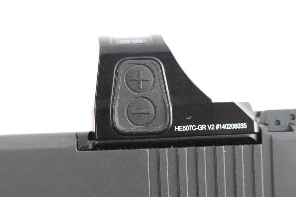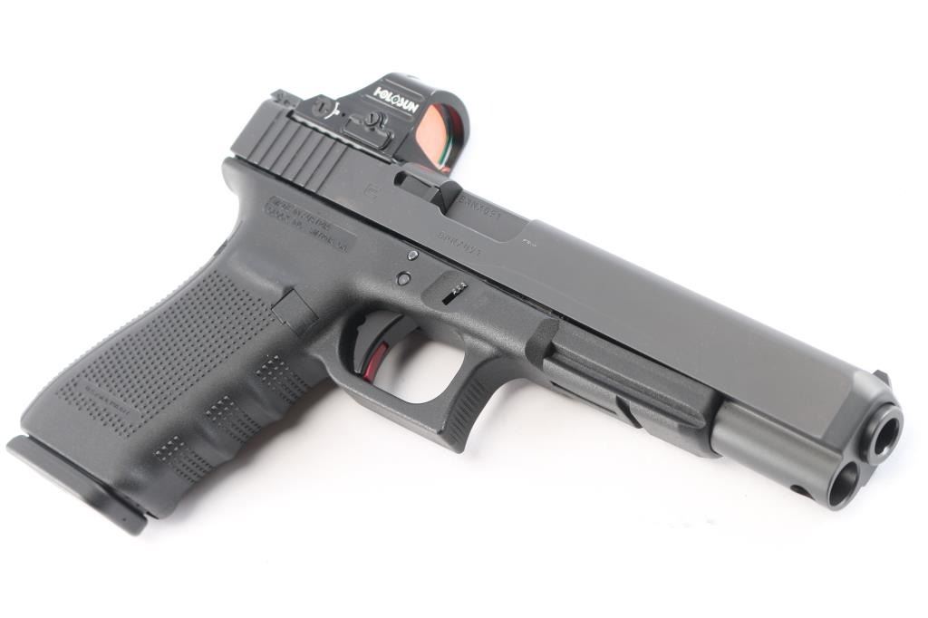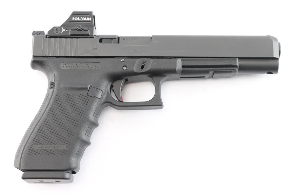 Austrian made Semi-automatic pistol. Matte finish slide. Black polymer frame with accessory rail, finger-grooved checkered grips. 5 3/4" barrel, white dot front, adjustable white outline rear sights, 14-rd factory magazine. Mounted with a Holosun green Reflex Pistol Sight - Shake-Awake Parallax. Bore is pristine. Action is tight, like new condition. Comes in the original Black plastic factory case, with manual, a total of six 14-rd factory magazines, two clear plastic ETS 30 magazines, optics/sight slide plates, cleaning bear and four extra interchangeable backstraps. Also included are a nice brown leather DeSantis snap holster and two magazine pouch.