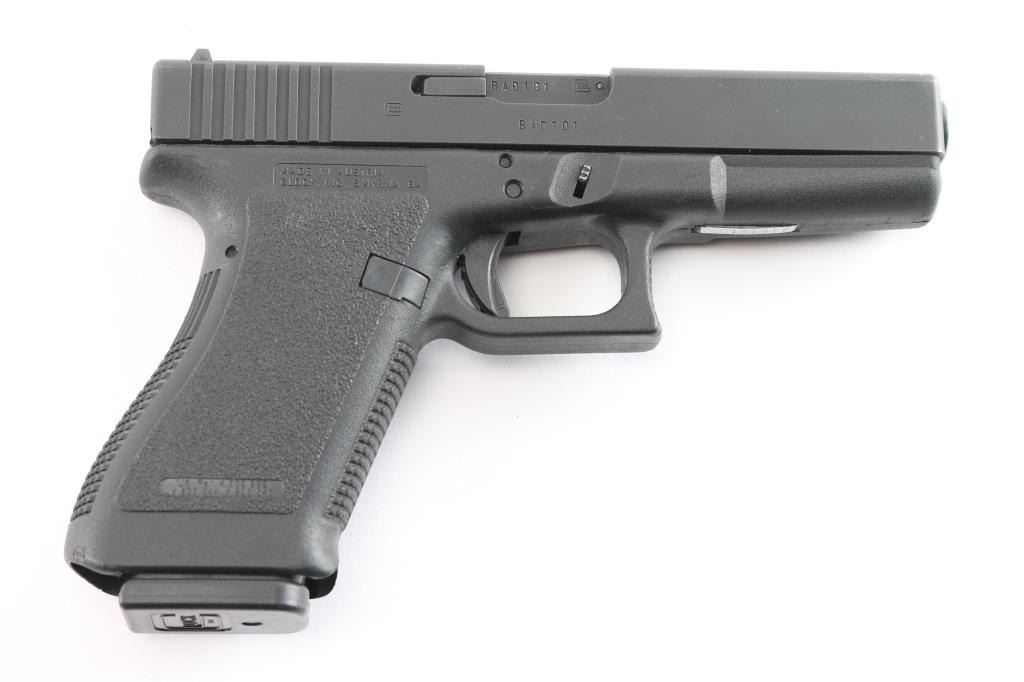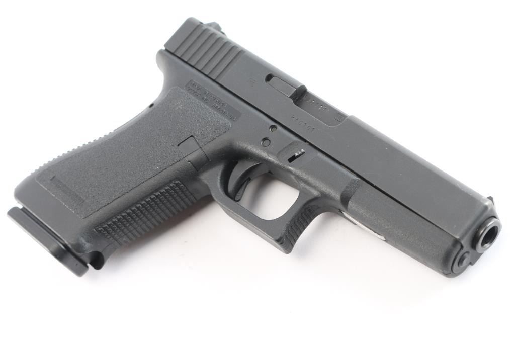 Austrian made full size safe-action semi-automatic pistol imported by Glock Inc, Smyrna GA. Features a black finished slide, 4.61" barrel, white dot front sight, dovetailed rear sight with white outlined square notch, trigger safety, push button magazine release, factory 15 round magazine, and durable black polymer frame with integral accessory rail & textured grip. Removable backstrap. Overall condition is like new with few signs of handling or use. Bore is excellent/bright