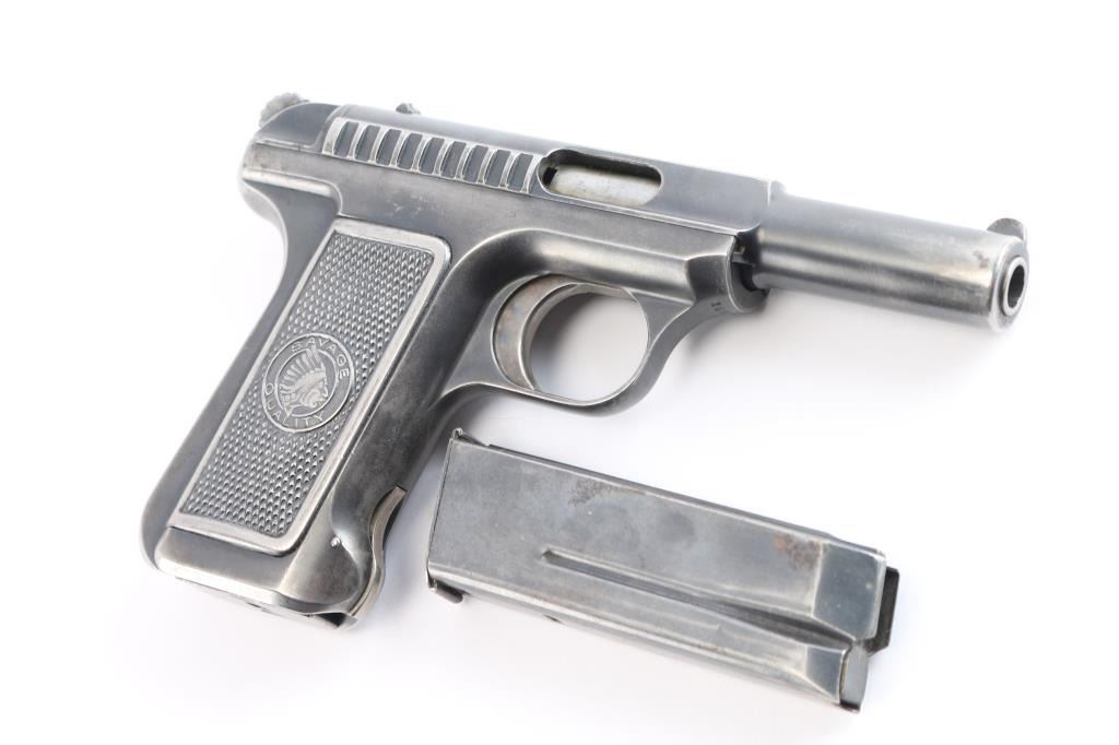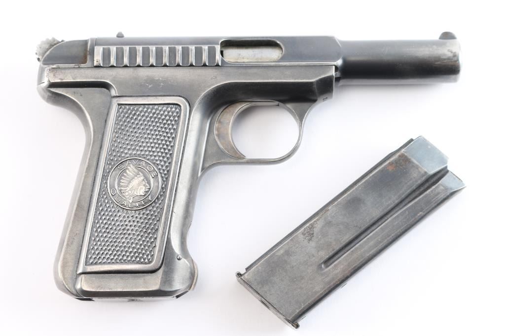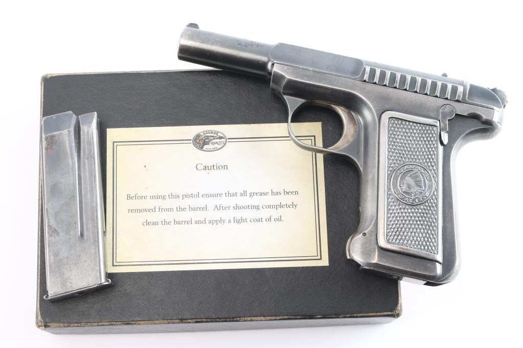Early M1907 Pocket Automatic pistol with rare sheet metal checkered grips marked "Savage Quality" with indian head motif. Single-action blowback, manufactured 1908, second year if production. The top of the slide is marked “Manufactured by Savage Arms Co.. UTICA, N.Y. U.S.A. CAL. 380. / Pat. Nov. 21, 1905. –.32 Cal.” The front of the frame under the barrel is marked “1642" 4 1/4” barrel with low profile rounded blade and u notch rear sights, manual thumb safety on left frame, mag release in fore grip, beveled mag well. The external “hammer” is really not a hammer but a cocking piece. Bore is very good/bright, strong rifling, slide action is smooth, faded case color showing on the trigger, blue finish is about 60% with some holster wear, handling wear mostly on the top of the frame and grip straps. Markings are crisp/clear. Comes in a quality reproduction box with labels, copy of old ad for this pistol, a small faux ivory "Savage Arms" plaque depicting an Indian Chief with a lever-action rifle and two factory 10-rd magazines.