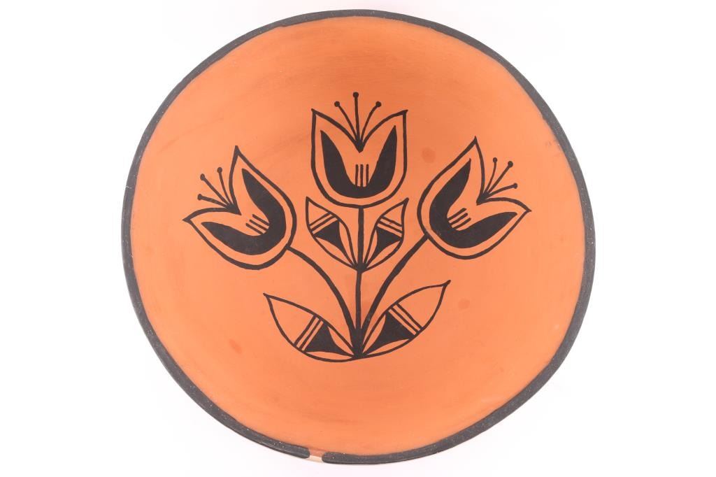 Measures 4 1/2" tall and 14" diameter. Painted with flower design inside and geometric design on rim outside. Signed Vicky Tenorio & Andrew Calabaza.