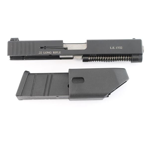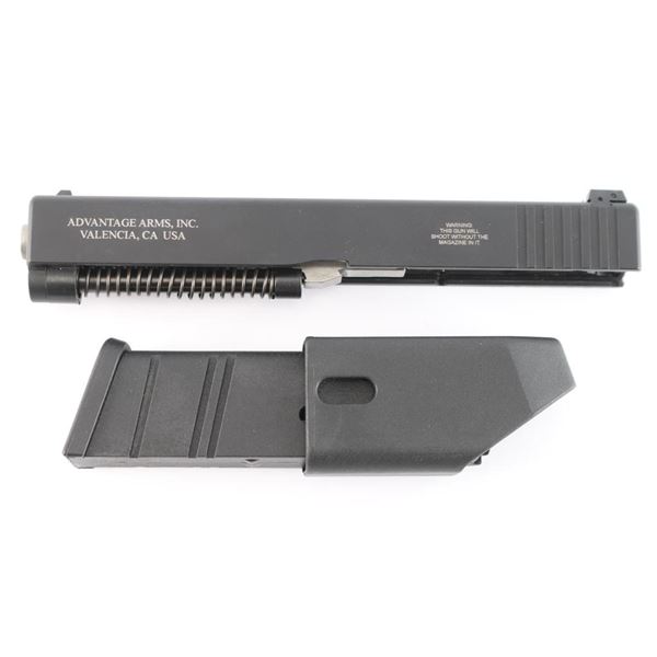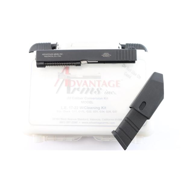 Advantage Arms .22LR Conversion Kit for Glocks. Fits: Glock-G17, g17L, G22, G31, G34, G35 and G37. (Do not use on Gen 4). The front and rear sights are removable GLOCK style sights. The rear sight is adjustable for both windage and elevation. The slide will lock open after the last round in the magazine has been fired, internal firing pin safety , all Aluminum parts are Anodized Per Mil-A-8625 with a matte black finish. All steel parts are heat treated with a Black Oxide Finish. The barrel is made from heat treated 416 Stainless Steel. Installation is simple and does not require any modifications to your GLOCK pistol. Includes complete slide, manual,10-rd magazine with loader and complete cleaning kit. In factory hard carry case. Excellent, like new.
