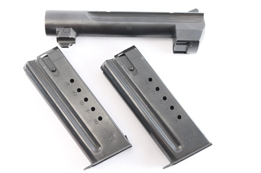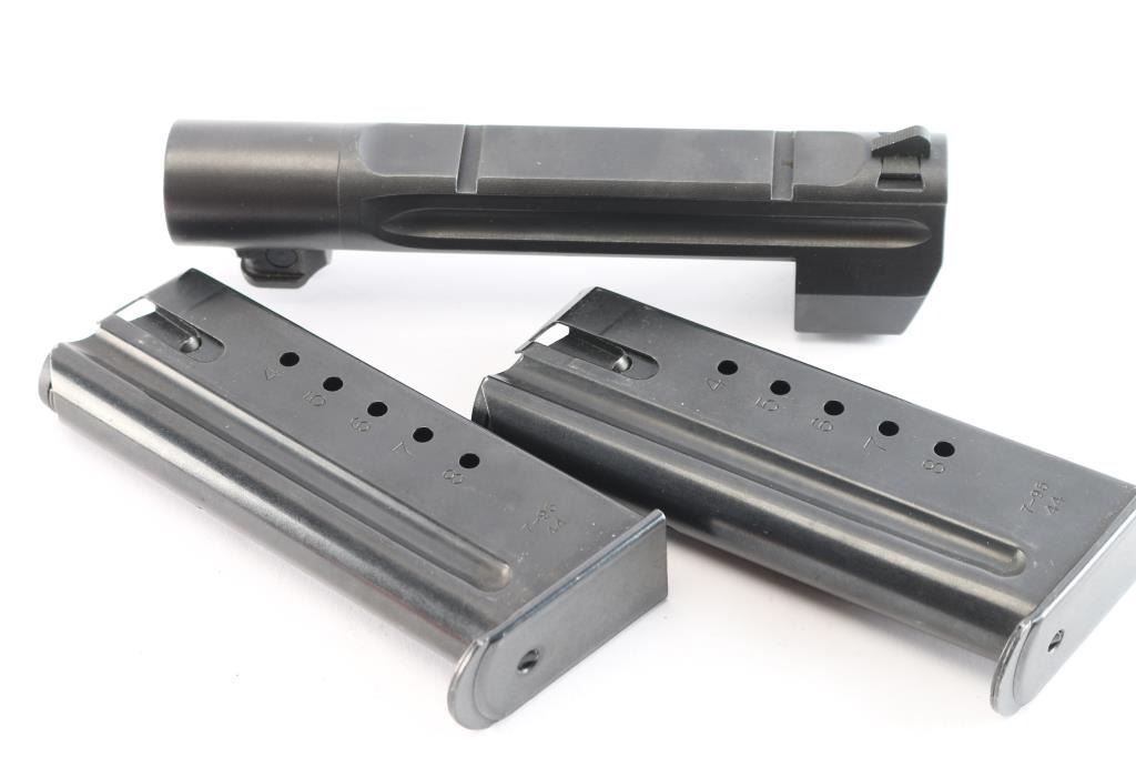 Includes 6" chrome lined barrel with dovetailed serrated front sight blade, two integral dovetails for sight/optics. Like new, bore and chamber are pristine. Two factory 8-rd magazines, like new.