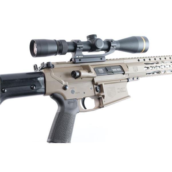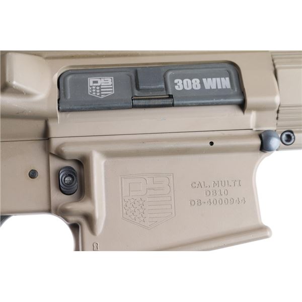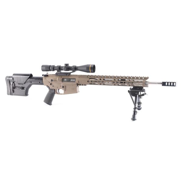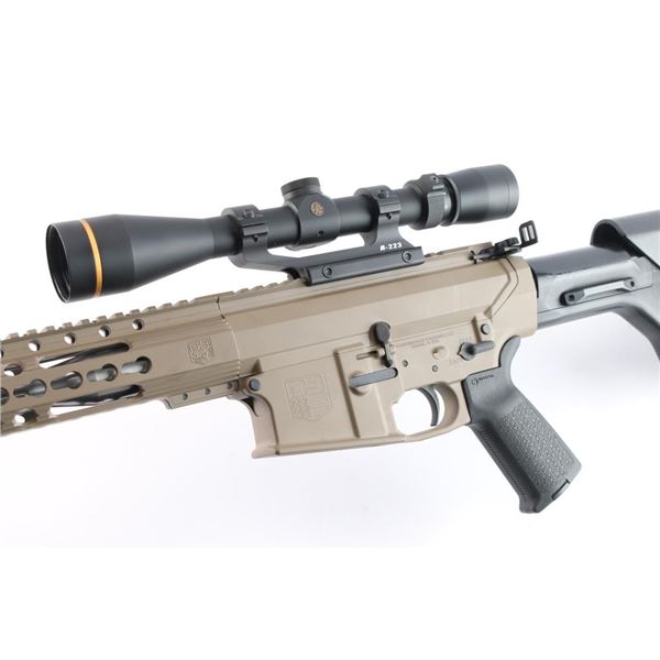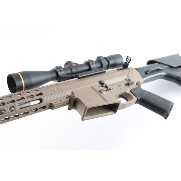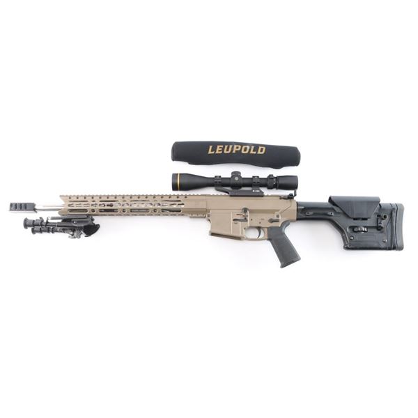 Direct impingement AR-10 platform semi-automatic modern sporting rifle chambered in .308 Winchester. Flat dark earth finish with matte black controls, Magpul PRS adjustable stock and MOE pistol grip. Features a stainless steel 18" fluted barrel with a 1:10 twist and four port muzzle break, mid-length gas system, FDE cerakoted 15" Keymod handguard & 7075-T6 forged aluminum receiver set with flat-top upper, forward assist, shell deflector, dust cover with caliber marking, Melonite coated bolt carrier, single stage trigger, thumb safety on the left side of the receiver, extended latch charging handle. 'Harris-style' adjustable bipod installed. No magazine, accepts SR-25/LR-308 mags. Installed Leupold VX-3i 3.5-10X40mm rifle scope on a M-223 mount w/scope cover. Bore is excellent/bright, action is smooth, finish is overall excellent with some scratches and wear on buttstock. Scope is clear. Condition is NRA Excellent. ***Modern firearm***.
