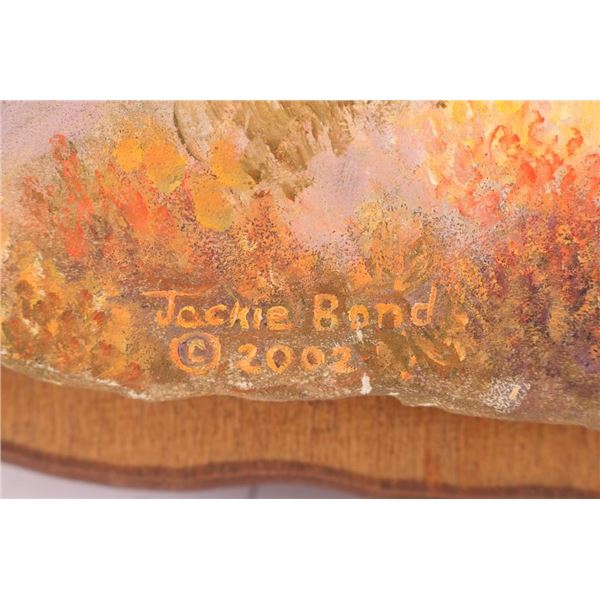 Measures 22" x 11". Mounted to wood and set for hanging on wall.