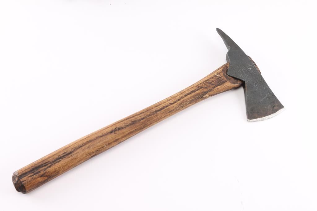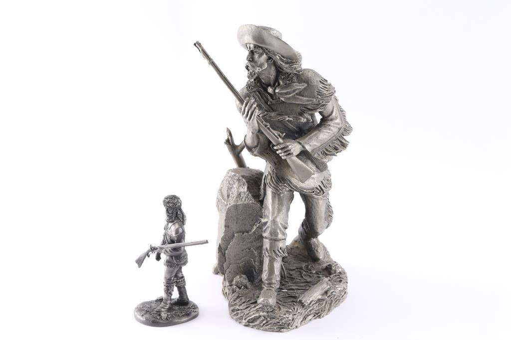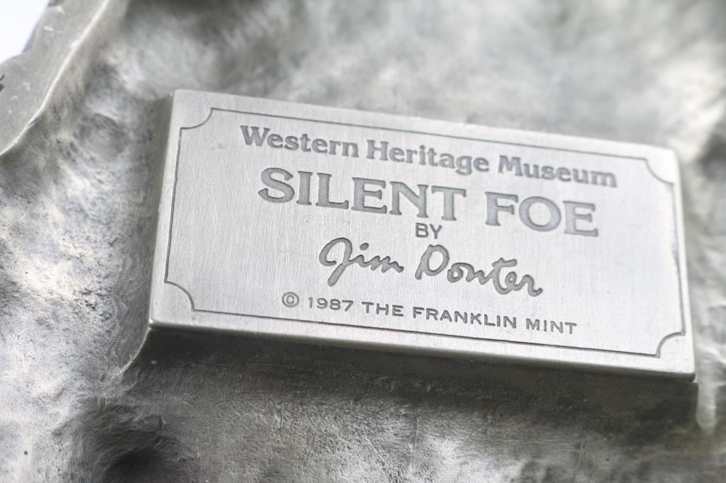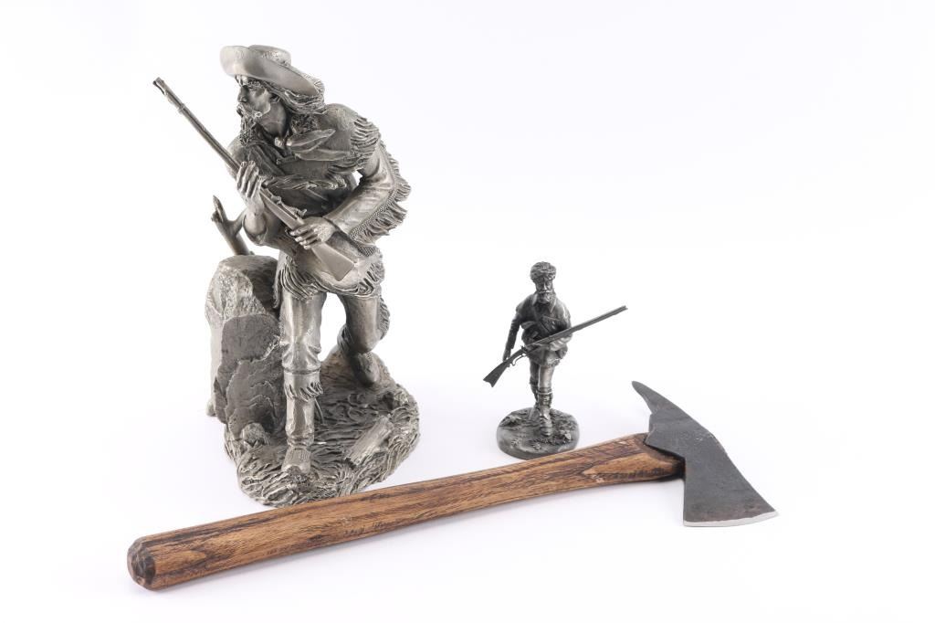 Includes a pewter statue titled "Silent Foe" by Jim Powter for the Western Heritage Museum's Franklin Mint series, dated 1987. Measures 10" tall x 5" wide x 6" deep. Also includes a miniature pewter mountain man from the Franklin Mint dated 1974. Measures 4 1/2" tall. Also includes a replica 19th century mountain man hatchet. Wood handle measures 13" and steel blade measures 5 1/2".