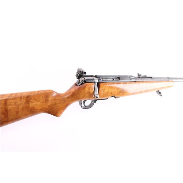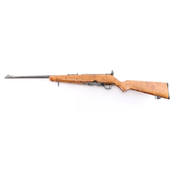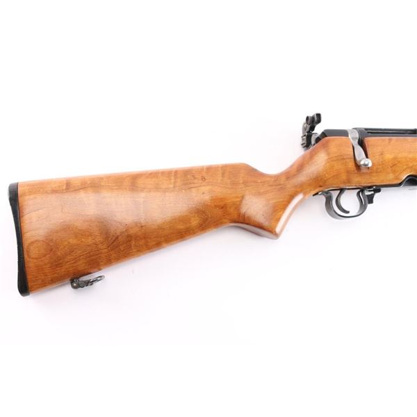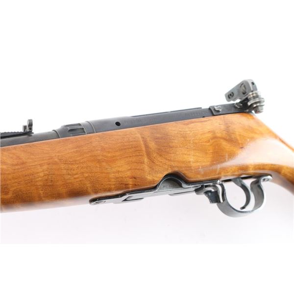Bolt-action rifle chambered in .30-30 Winchester. Mfg. 1947-50. Features a blued finish, 21" barrel, raised beaded blade front sight, elevation adjustable sporting rear sight, receiver mounted WFC No. 175 adjustable peep sight, receiver stamped "STEVENS" on left side, thumb safety right side back of receiver, serrated curved trigger, butterknife bolt handle, magazine release lever in front of trigger guard. Smooth wood stock w/ serrated butt plate and sling swivels on studs. Bore is good. Retains approx. 50% finish w/ heavy wear on the barrel, scattered scratches and tooling marks on the barrel nut. Wood is very good with minor blemishes. Comes with one box magazine. NRA Condition is Good. ***C&R Firearm***.