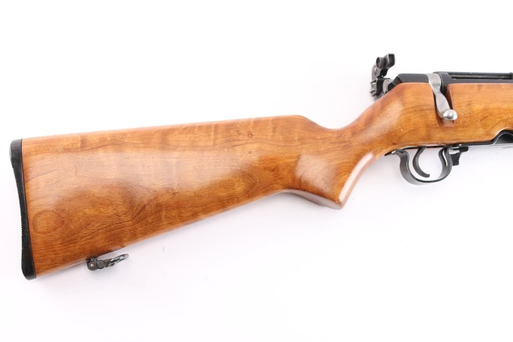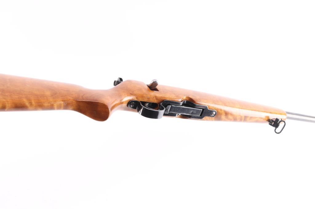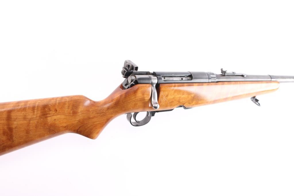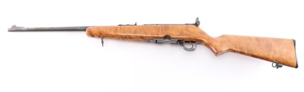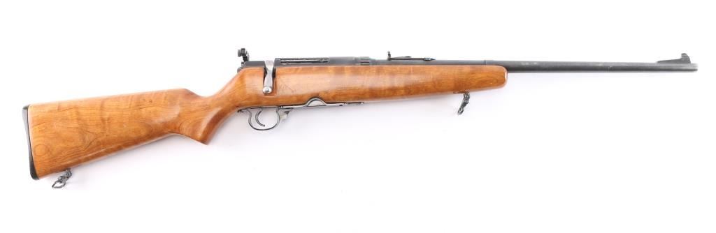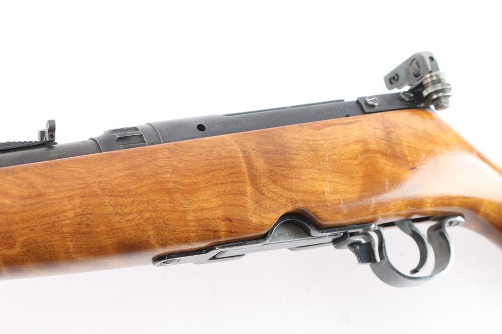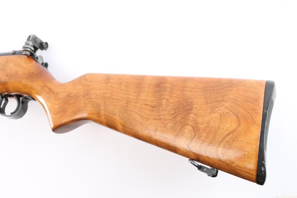 Bolt-action rifle chambered in .30-30 Winchester. Mfg. 1947-50. Features a blued finish, 21" barrel, raised beaded blade front sight, elevation adjustable sporting rear sight, receiver mounted WFC No. 175 adjustable peep sight, receiver stamped "STEVENS" on left side, thumb safety right side back of receiver, serrated curved trigger, butterknife bolt handle, magazine release lever in front of trigger guard. Smooth wood stock w/ serrated butt plate and sling swivels on studs. Bore is good. Retains approx. 50% finish w/ heavy wear on the barrel, scattered scratches and tooling marks on the barrel nut. Wood is very good with minor blemishes. Comes with one box magazine. NRA Condition is Good. ***C&R Firearm***.