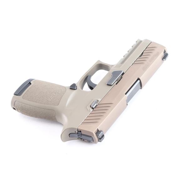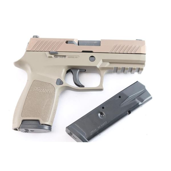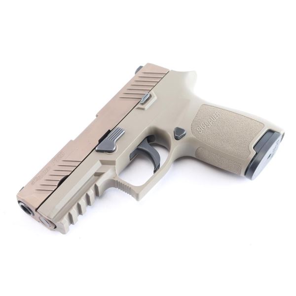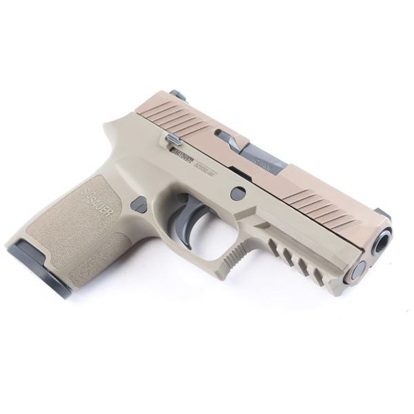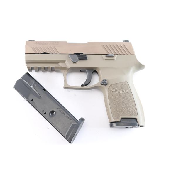 Semi-automatic pistol features approx 3.75" barrel, 3 dot night sights in dovetails, striker fired, dark earth or FDE finish, matte black controls, tan colored polymer frame with accessory rail, reversible push button mag release, ambi slide lock. Bore is excellent/bright. Retains 98% finish with little wear. Night sights easily visible in a dark room. Comes with two magazines, 13rd & 10rd. Condition is NRA excellent. ***Modern Firearm***.