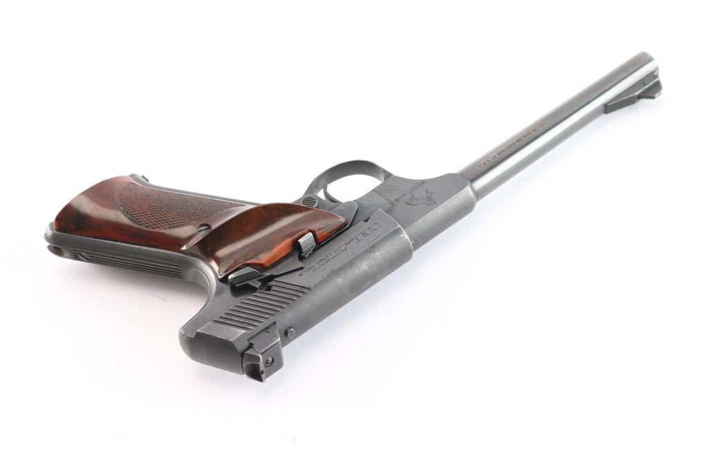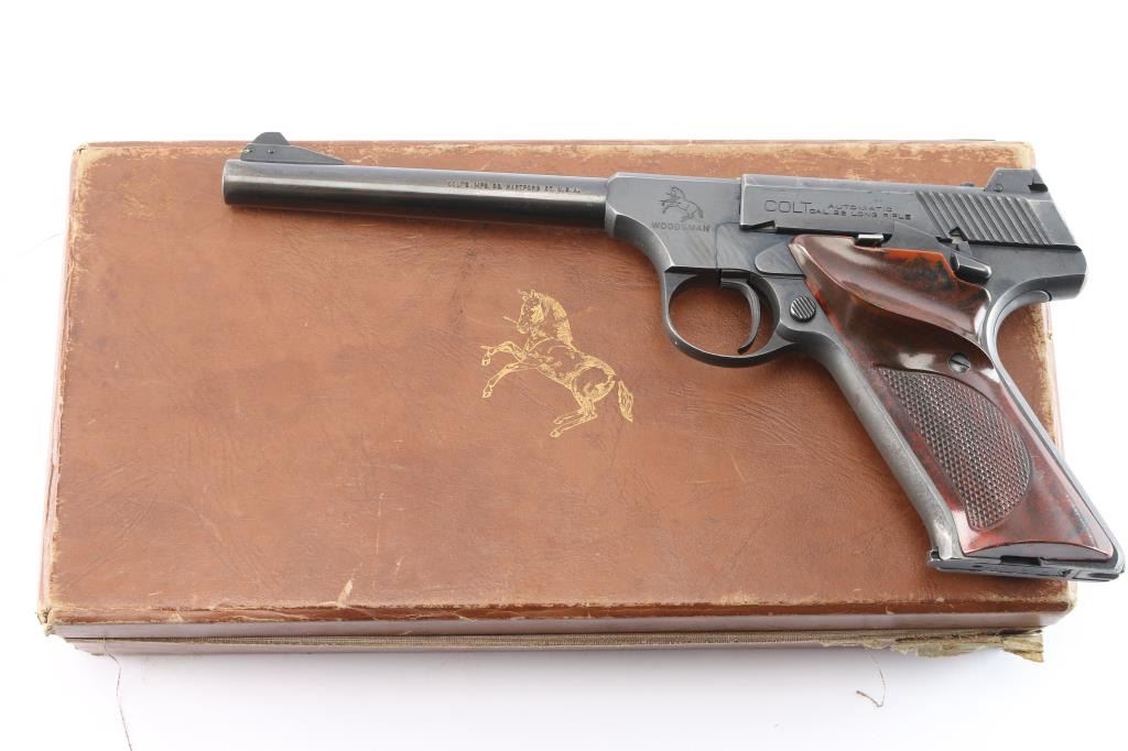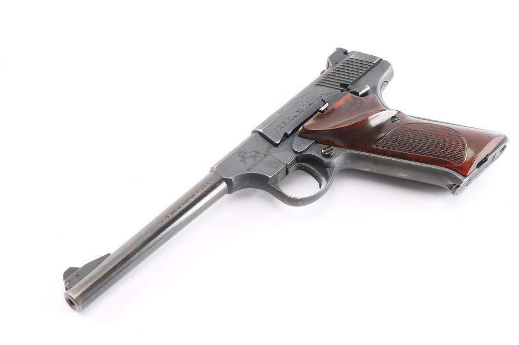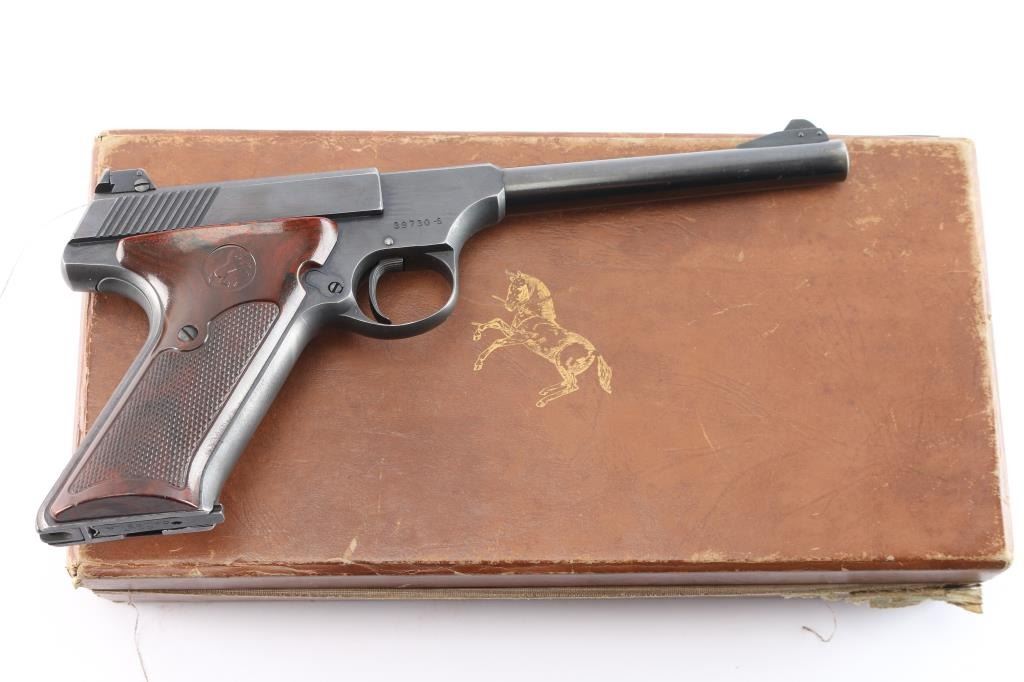 Vintage semiautomatic rimfire pistol, manufactured circa 1950. 2nd series Target model. Features blued finish, checkered Coltwood grips with thumb rest on the left panel and 'Rampant Colt' motif on the right, 6" round barrel, adjustable sights, heel magazine release, manual safety, serrated backstrap and lanyard stable in heel. Bore is excellent/bright, grips are excellent, Colt marking are sharp, slide action is smooth and the original blue finish is about 75% with holster wear, minor scratches and handling wear on the straps. Comes with the original period-correct factory box with green interior, gold toned "Colt" & "Rampant Colt" motifs, cleaning brush, instruction sheets. One Colt marked magazine.
