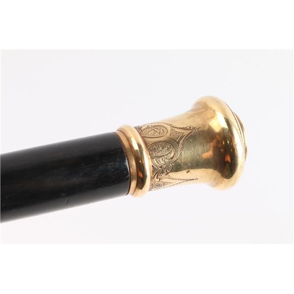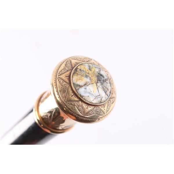 Gold filled and authentic rich gold quartz sample from California mine, from styling circa 1850's-1900. Measures 35 1/2" from tip to end. Approximately 7/8" across center of round shaped gold quartz sample in tip. Cane is good but quartz shows some cracking.