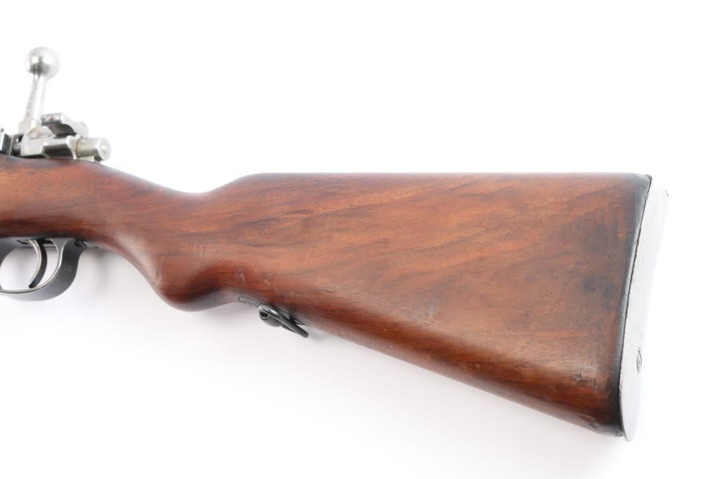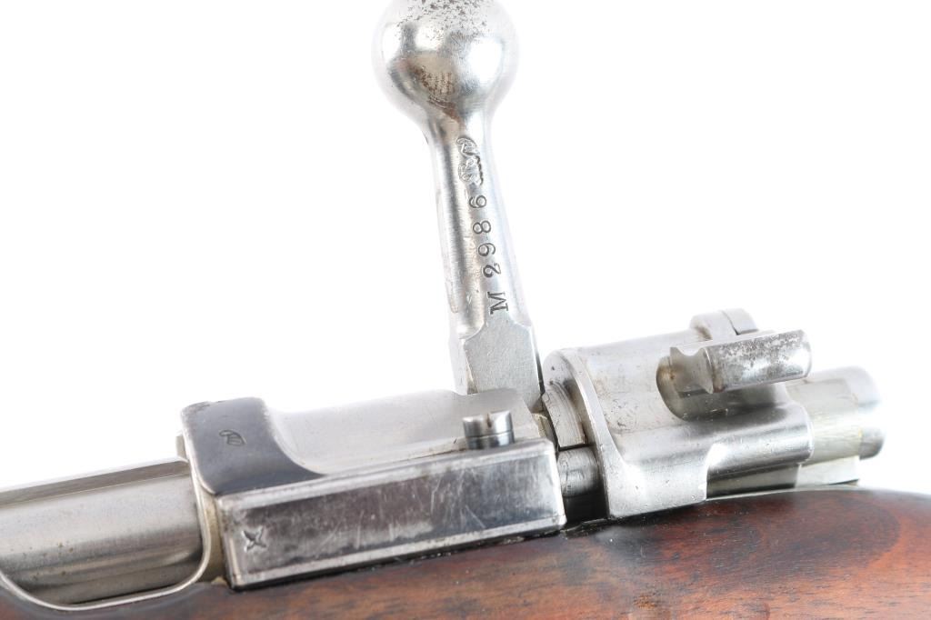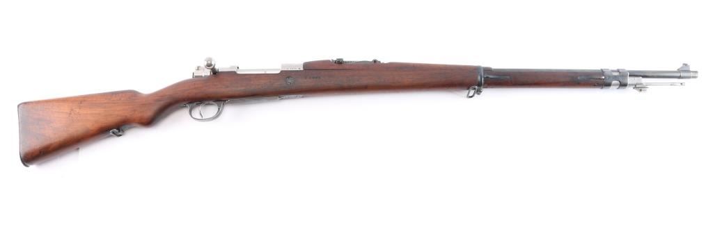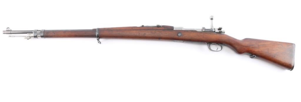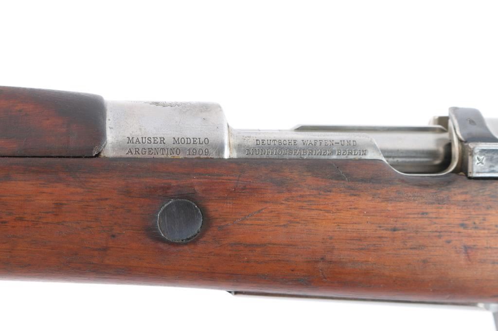 Bolt-Action Argentinean military contract rifle, manufactured by DWM in Germany. 7.65x53mm Mauser. Argentinean crest on receiver ring with "Mauser Modelo Argentino 1909". DWM, Berlin markings on rail. 29" barrel, straight bolt handle,raised blade front, tangent rear sights, sling swivels, bayonet lug, hinged floorplate, cleaning rod under barrel. Matched serial numbers on receiver, bolt, triggerguard, cleaning rod and stock. Bore is excellent/bright.. Retains 95% blued finish. Receiver, buttplate, bayonet lug and bolt are polished. Wood is in very good condition with few observed small dents, scratches, and handling marks. Action is crisp/tight.