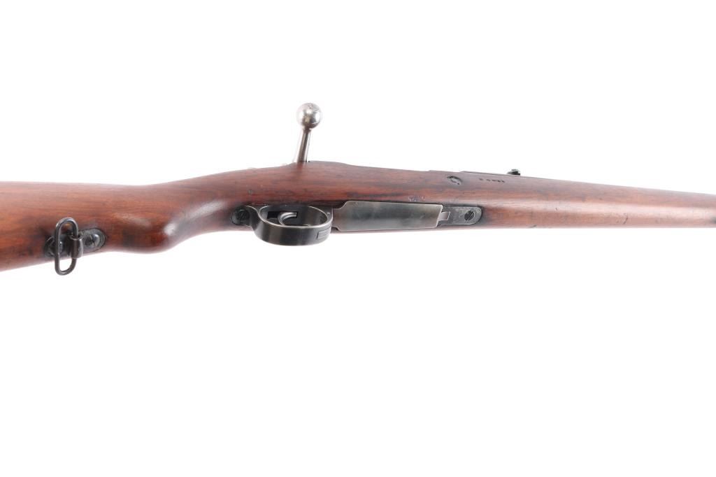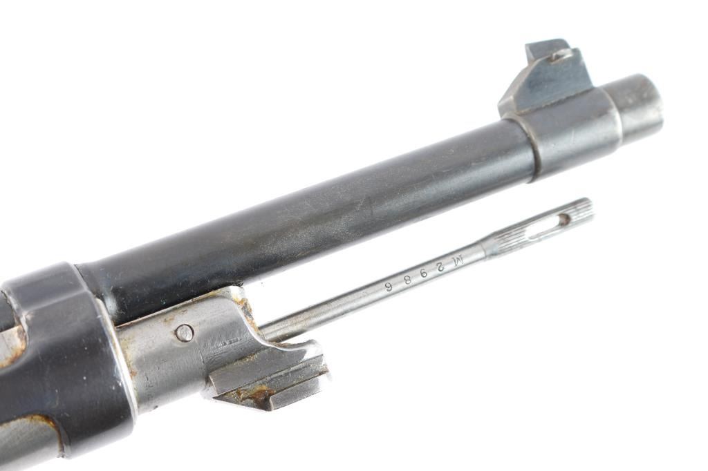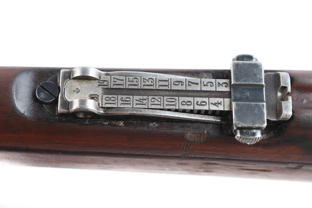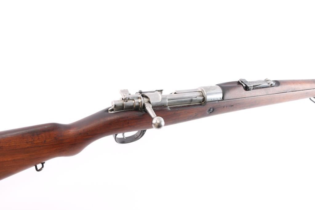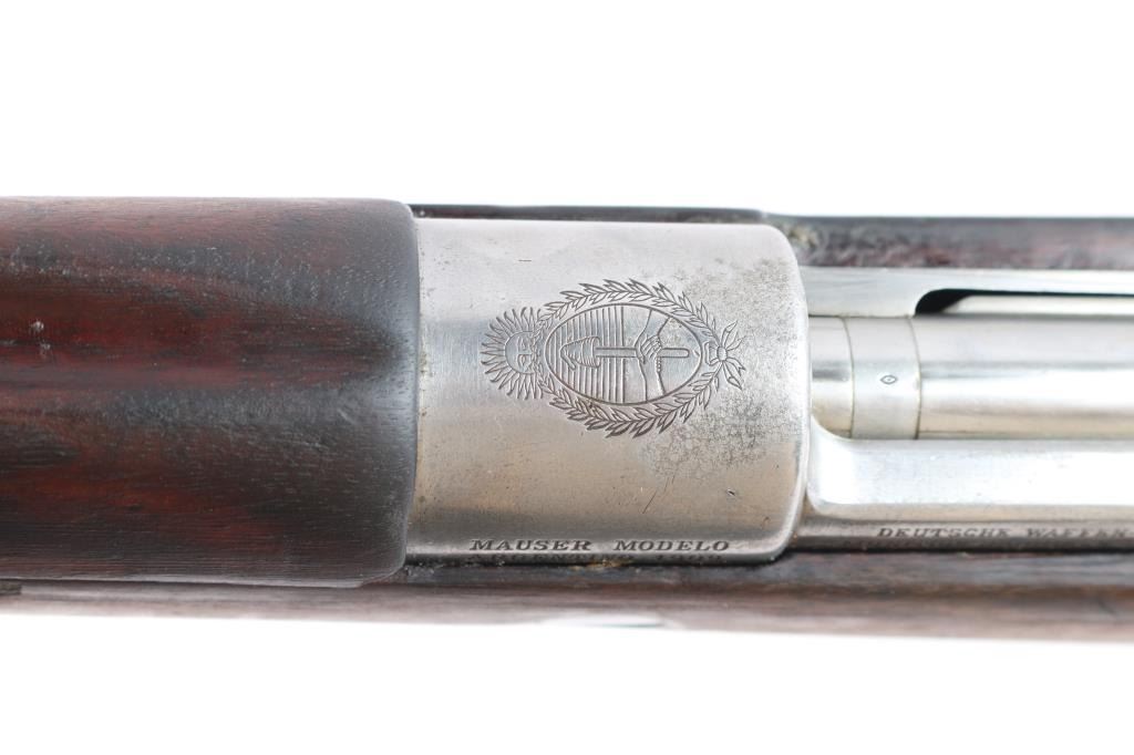 Bolt-Action Argentinean military contract rifle, manufactured by DWM in Germany. 7.65x53mm Mauser. Argentinean crest on receiver ring with "Mauser Modelo Argentino 1909". DWM, Berlin markings on rail. 29" barrel, straight bolt handle,raised blade front, tangent rear sights, sling swivels, bayonet lug, hinged floorplate, cleaning rod under barrel. Matched serial numbers on receiver, bolt, triggerguard, cleaning rod and stock. Bore is excellent/bright.. Retains 95% blued finish. Receiver, buttplate, bayonet lug and bolt are polished. Wood is in very good condition with few observed small dents, scratches, and handling marks. Action is crisp/tight.