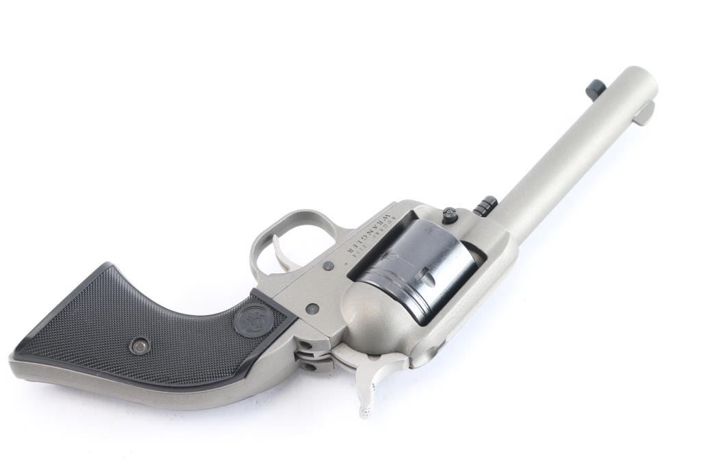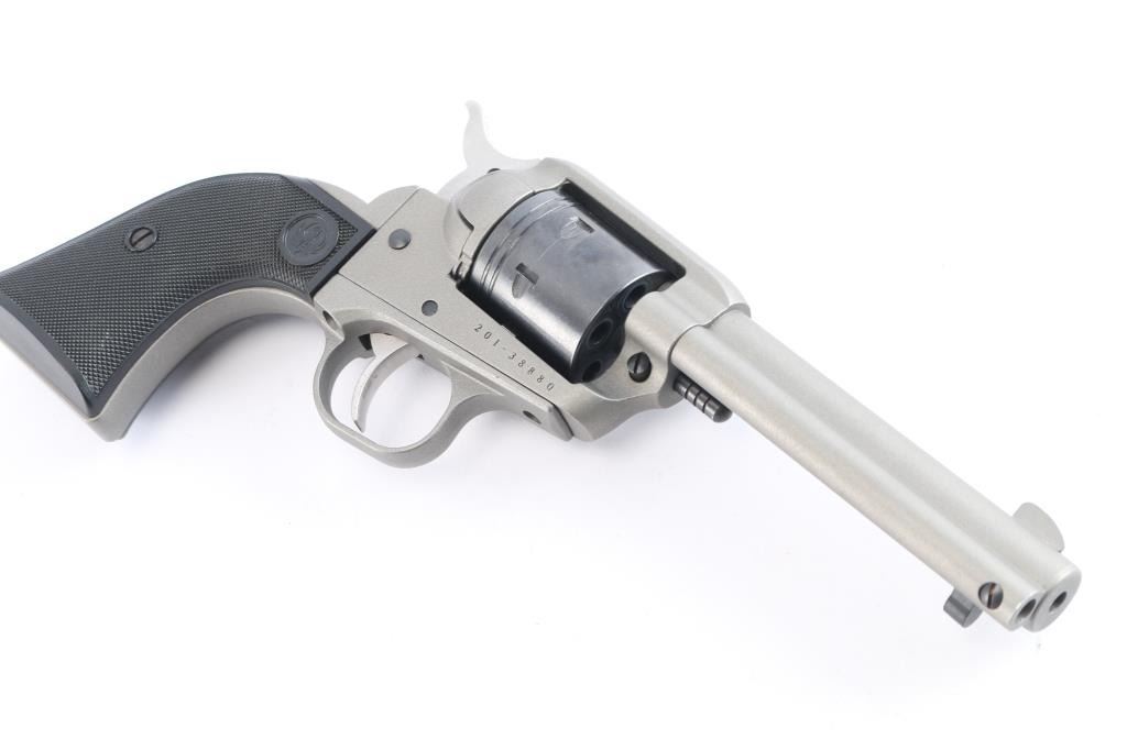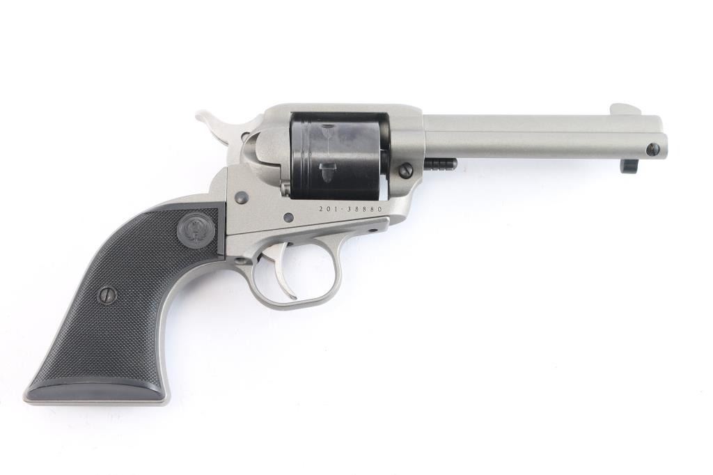 American made 6 shot revolver, chambered for .22 LR. Features a 4.75" barrel, blade front and integral notch rear sights, transfer safety bar and loading gate, smooth curved trigger and knurled hammer spur. Silver cerakote finish, blued non-fluted cylinder and knurled hammer spur. Two piece checkered black synthetic grips with Ruger logo. Bore is excellent. Retains approx. 98% finish with a faint drag line on the cylinder. NRA condition is excellent. ***Modern Firearm***.