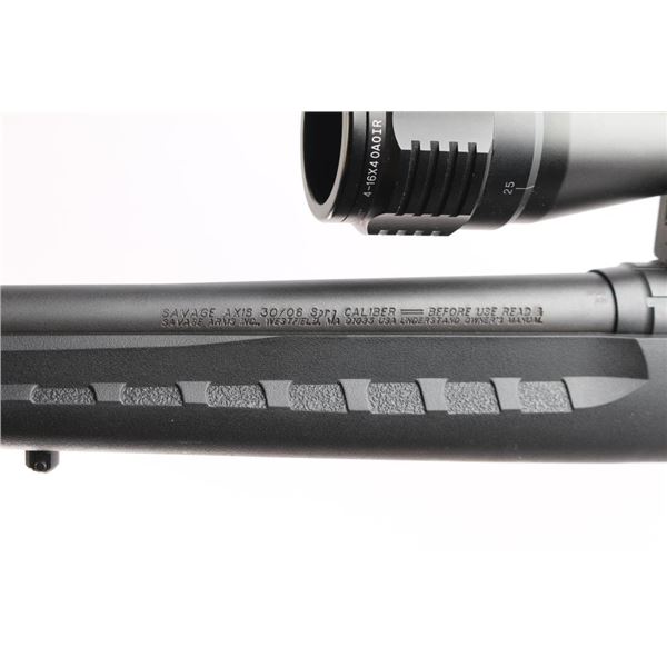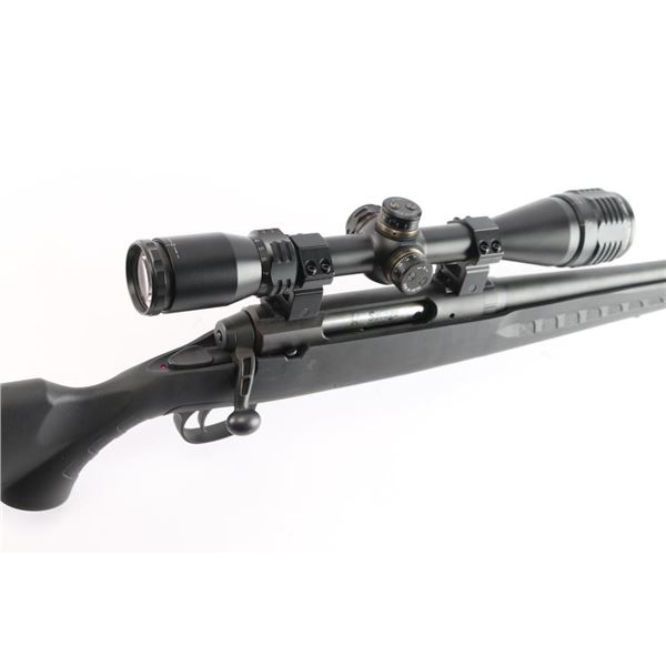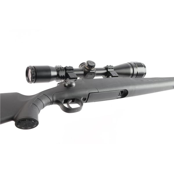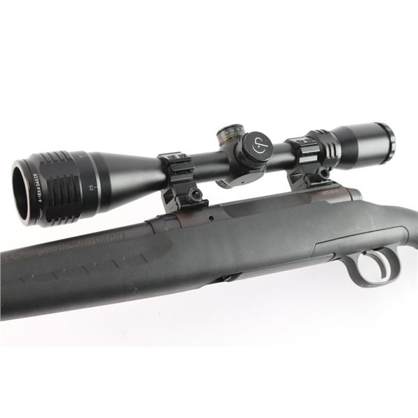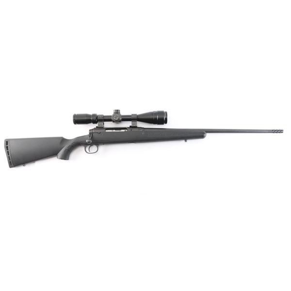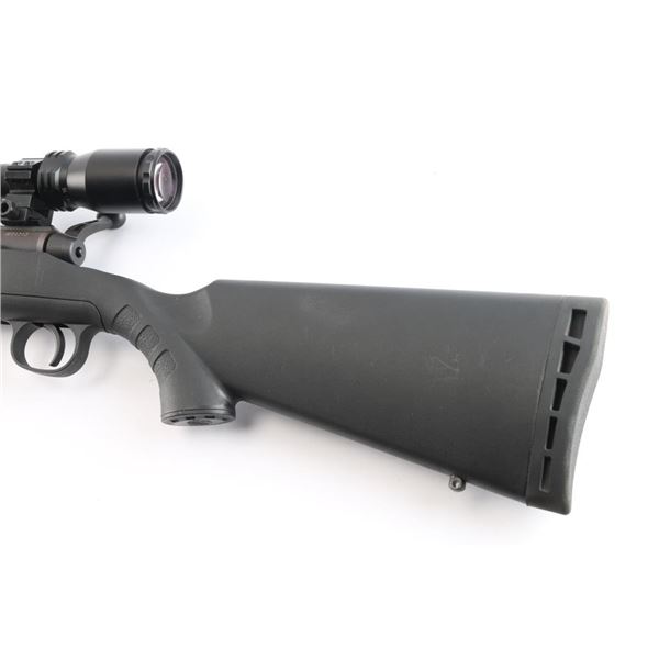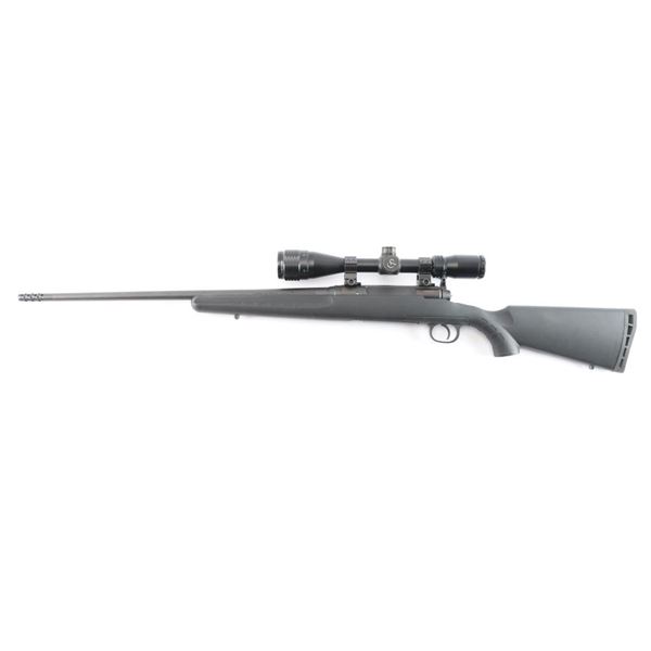 Bolt action rifle chambered for .30-06 Springfield. Features a matte black finish, black polymer stock with sling swivel studs, 24 1/4" barrel with ported muzzle break installed, no provisions for sights, detachable box magazine, manual safety, ventilated recoil pad. Mounted with a Center Point 4-16x4 OAOIR scope, Mil-Dot reticle, clear optics. Overall condition is excellent. Bore is excellent/bright.
