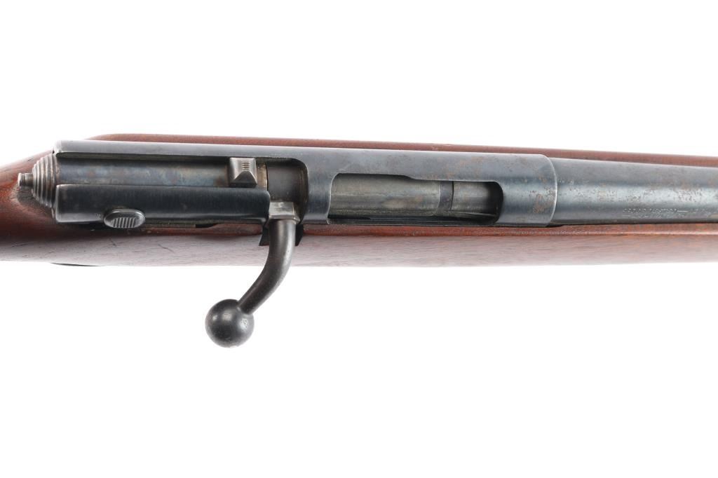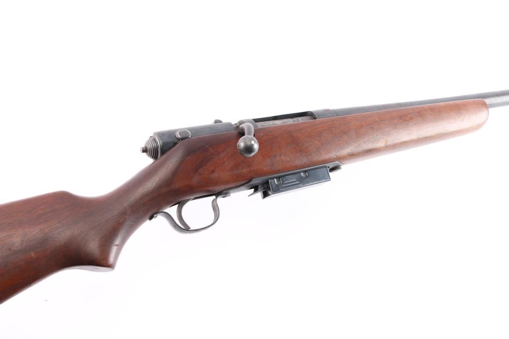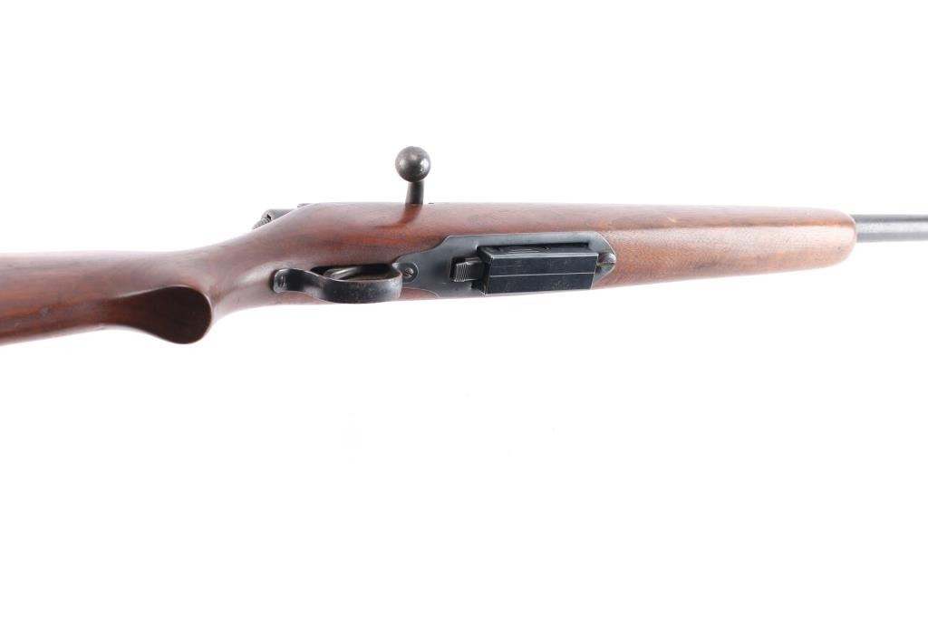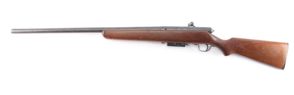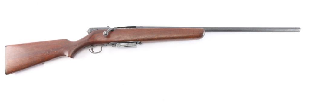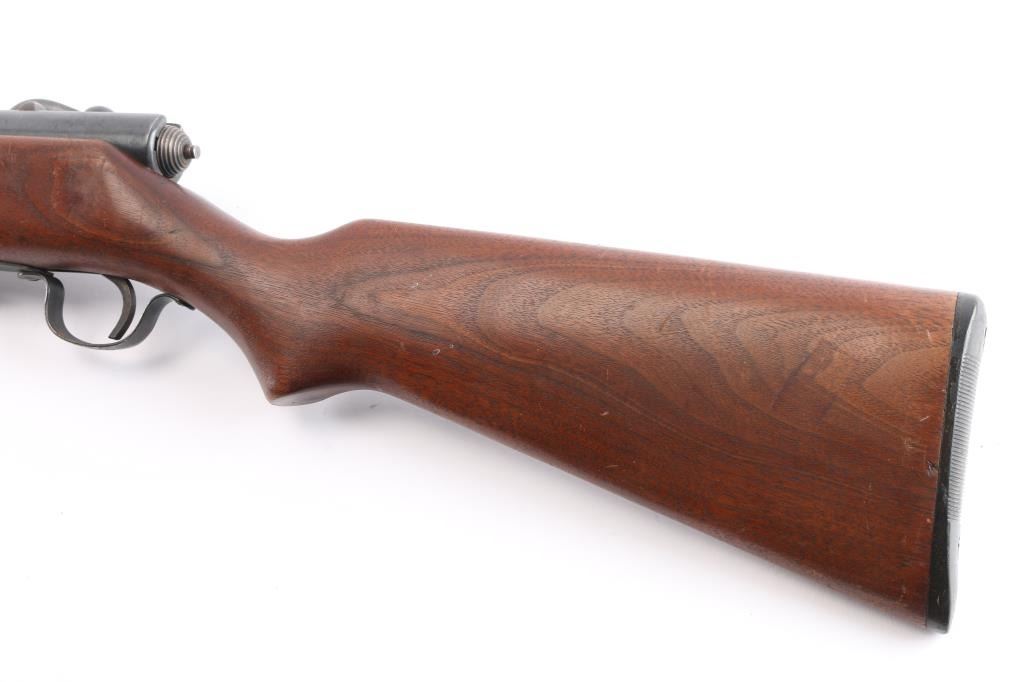 Vintage magazine fed bolt action shotgun chambered for 2 3/4" 12 gauge shells, manufactured in Chicopee Falls, Mass.. Features a blued finish, 26" barrel, steel bead front sight, smooth trigger, manual safety on the right side of the receiver, cocked indicator on the rear of the bolt, factory magazine, swept back bolt handle, and smooth semi-pistol grip shoulder stock with black plastic buttplate. black painted fore cap. Shotgun retains approximately 90% of its blued finish showing scattered light pitting, thinning . Action is smooth/tight, the bore is good/bright and the wood stock is good/sound with some scratches/scuffs.