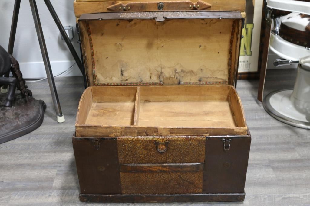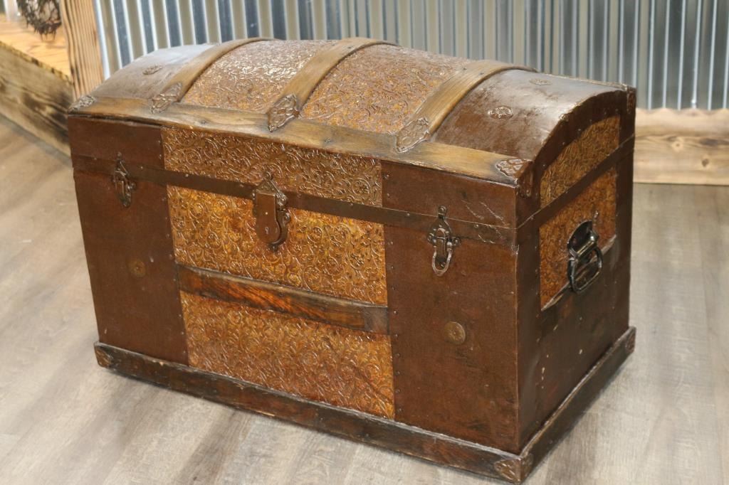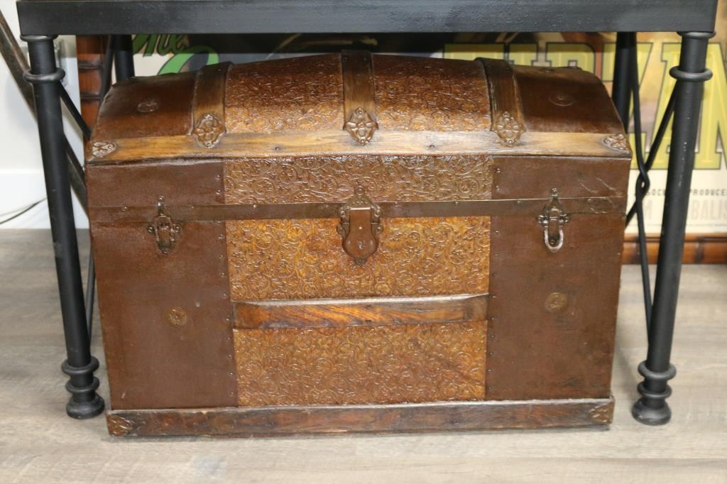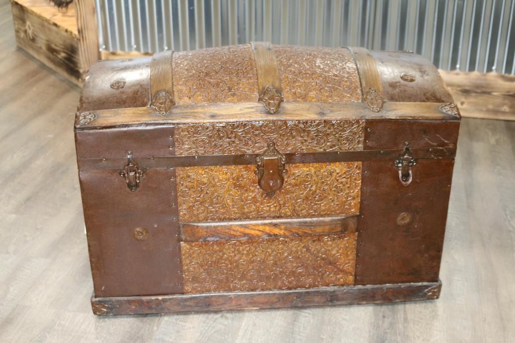 Covered in metal and decorative leather with drop in organizer. Measures:22"H x 32" x 17"D. SHIPPING MUST BE ARRANGED BY BUYER.