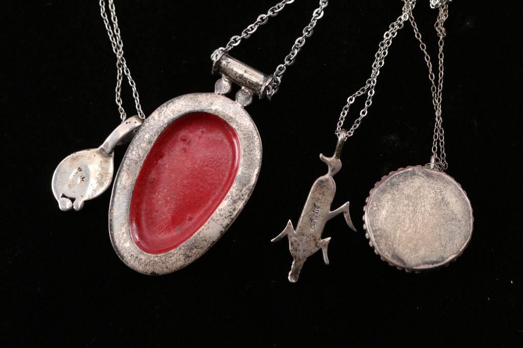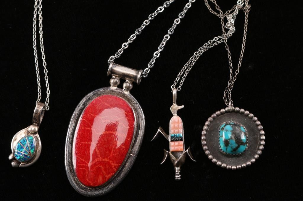 Includes one with man-made opal inlay; one with turquoise stone; one in sterling shaped as corn with rose quartz, onyx or jet and turquoise; one with a large red oval shaped pendant.