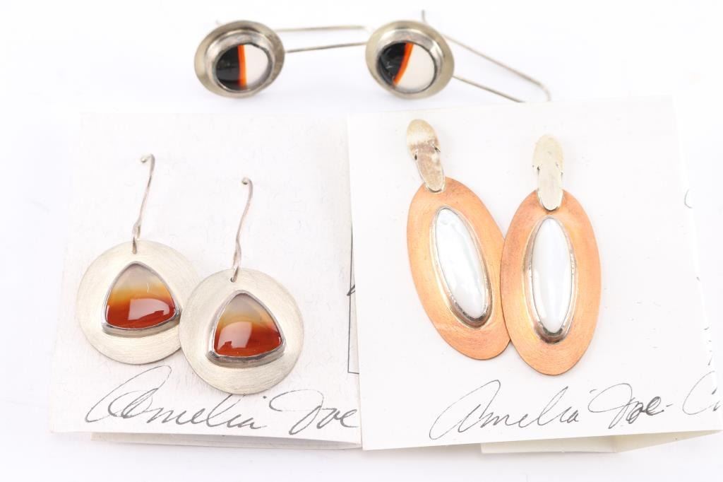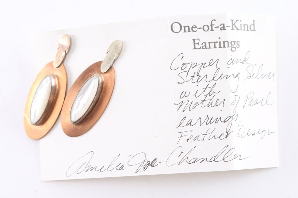 Navajo Amelia Joe-Chandler's jewelry is designed after the Dine’ (Navajo) philosophy of life, which encompasses air, fire, water, and earth. The four sacred directions, colors, plants, and mountains are also an integral part of her designs. Her jewelry is set in sterling silver and one pair of these uses copper as well. Maker marked.