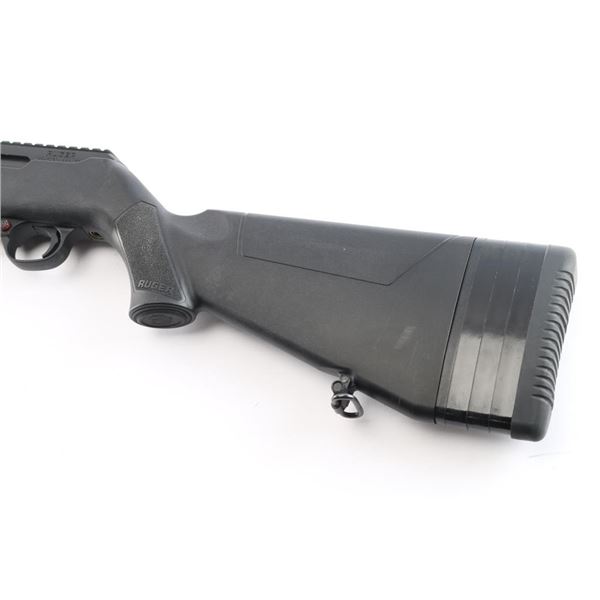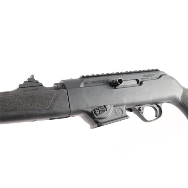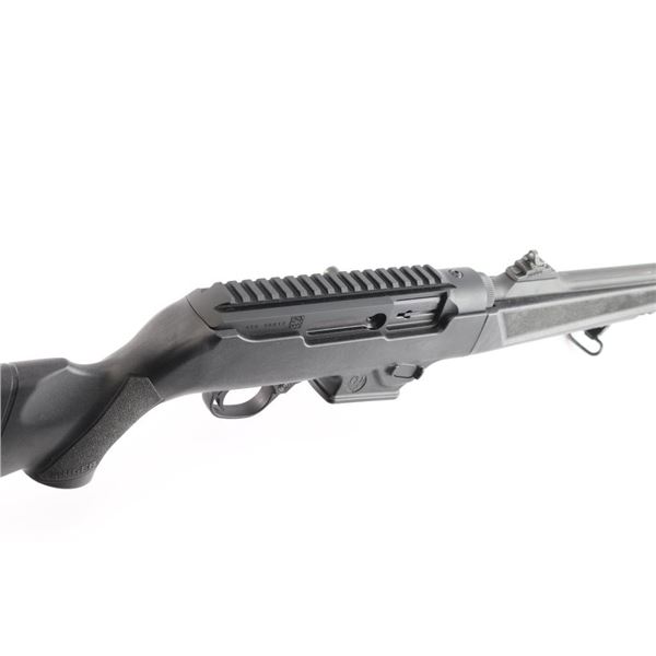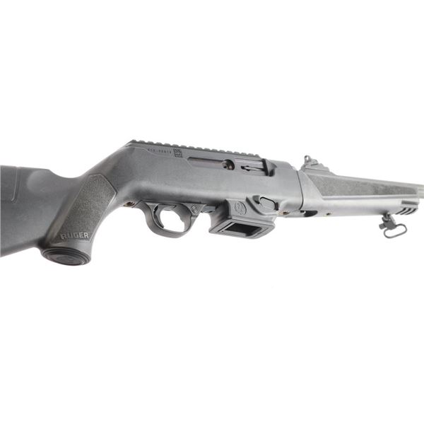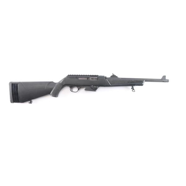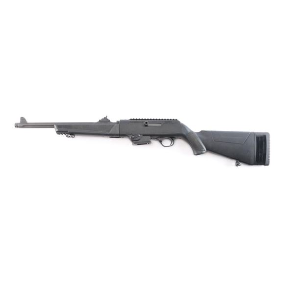 'Dead blow' action semi-automatic take-down rifle chambered in 9x19mm, manufactured circa 2018. Features a threaded and fluted 16" cold hammer forged chrome-moly steel heavy barrel with matte black finish and thread protector, shrouded blade fixed front sight, sliding adjustable ghost ring rear sight, CNC machined 7075-T6 aluminum alloy receiver with Type III hard-coat anodized matte black finish, reversible push button magazine release, reversible cylindrical charging handle, interchangeable double stack Glock 9mm pattern magazine well, push button safety, serrated curved wide trigger, black polymer forend and pistol grip shoulder stock with stippled panels at wrist and forend. Serrated black rubber recoil pad w/spacers and sling swivels attached. Bore is very good. Retains approx. 95% finish with slight edge losses, scratches, and slight wear to polymer. Action is smooth. No magazine or box. Condition is NRA very good. ***Modern Firearm***.