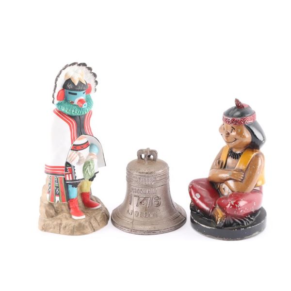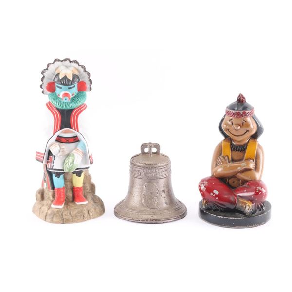 One is a cast iron liberty bell, with some coins inside. Measures 4 1/4" tall and 4" across. One is a metal Indian sitting cross legged, bottom states The Gramatan National Bank and Trust Company, Bronxville, New York, measuring 7" tall and 4 1/2" wide. And one is a porcelain kachina doll from the Arizona Bank and measures 8 1/4" tall and 4" wide.
