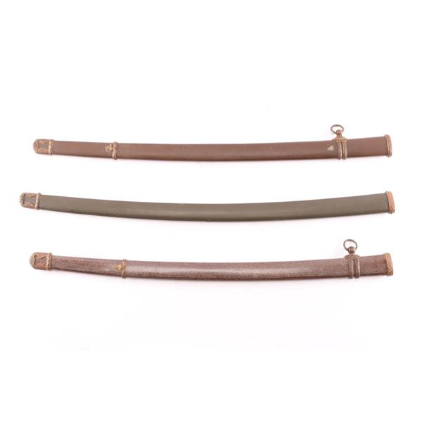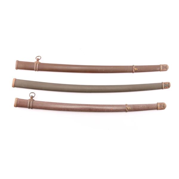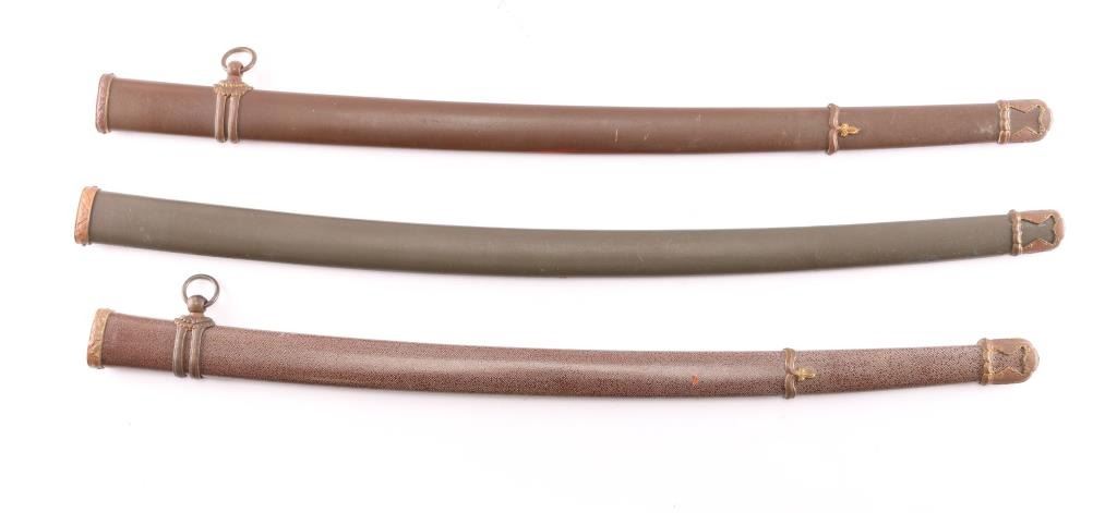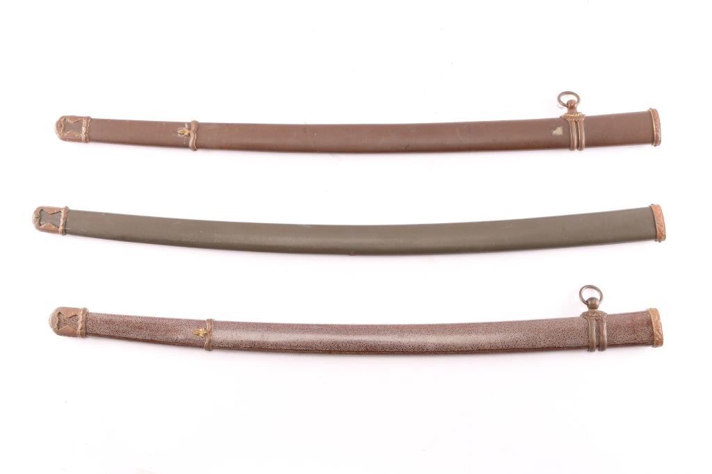 Lot of three WWII Japanese Army Officers Type 98 Shin-Gunto Sword scabbards. 1) 28 1/2" metal scabbard with bronze toned Koiguhi, single loop Ashi, Semegane and Ishizuke drag fittings in place. Chocolate brown paint. Overall very good condition, missing the spring clip. 2) Same as above but 27 3/4", wooden scabbard wrapped in lacquered Shark-skin, also missing the spring clip. 3) 29 1/4" metal scabbard with the koiguchi and Ishizuke fittings only, olive green paint, also missing the spring clip.