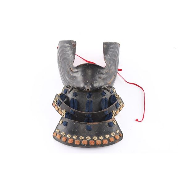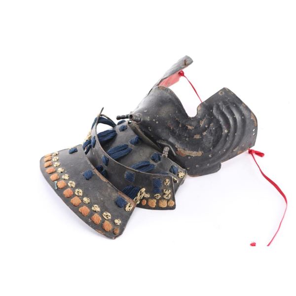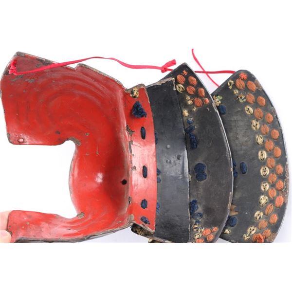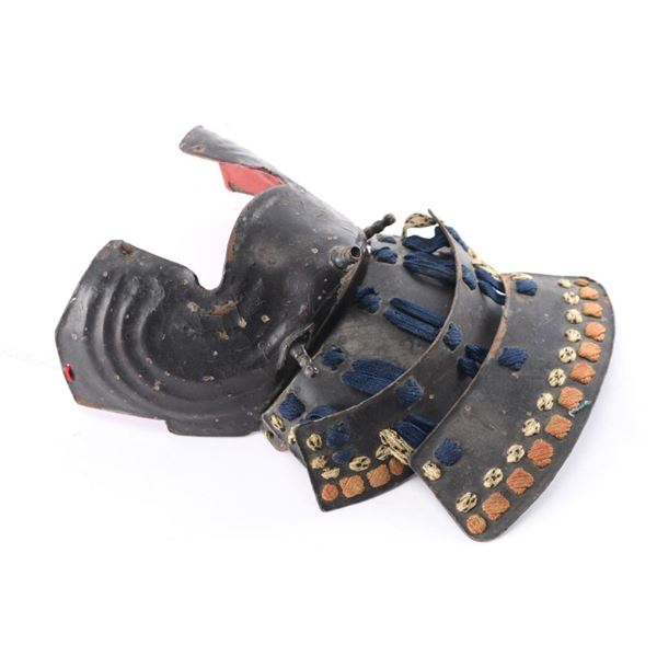 Metal, lacquer. Japan. Mempo is a general term for these mask-like face guards of warriors –The mouth is open, screaming to show the teeth rows, jutting chin and signalizing determination. The neck protection (Suga)composed of three plates (Lames) is decorated with silk cords and the parts are thus also interconnected and movable. Suspended by closely spaced blue laces. Traditional exterior black, interior red lacquering. Has protruding Ase-Hagashi-No-Ana in chin. (perspiration dripping hole), two pegs in the form of bamboo stems are located on the sides of the chin. Their function is to help in the securing of the helmet tying cord. No nose piece, one peg for this is broken. Lacquer has chips & cracks. Believe 18th Century.