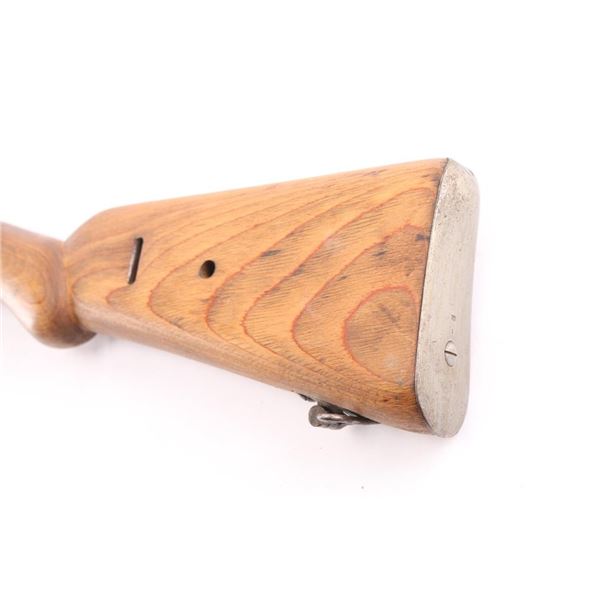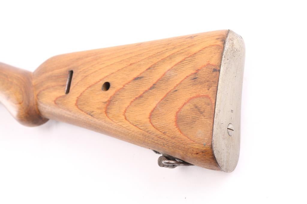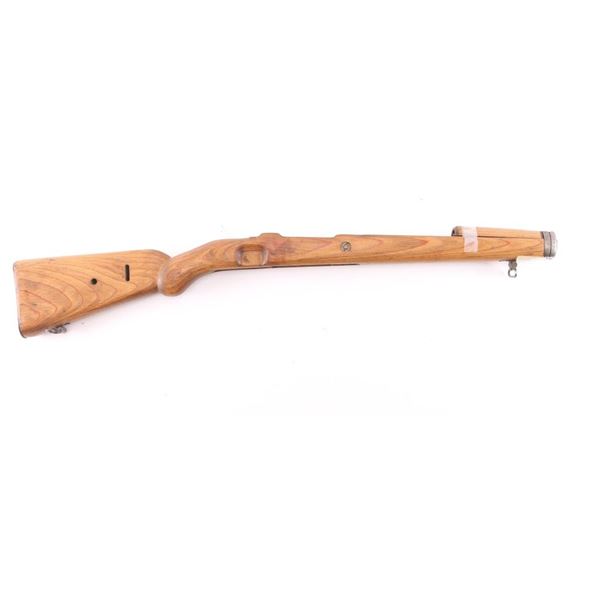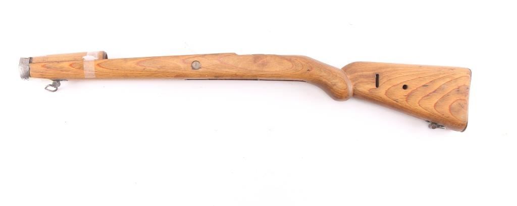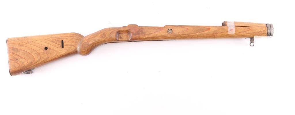 Original era K98 rifle stock complete with laminated wood stock, upper handguard, front barrel band, steel buttplate and sling swivels. Band has eagle/Swastika proof and serial number '9411. Buttplate has matching serial number and waffenamt eagle/WaA1. ( Berlin-Suhler Waffenwerke, Suhl 1937-40) The stock has been modified by sanding down the shoulder stock marking the grip more pronounced and rounded. Good condition with no cracks.