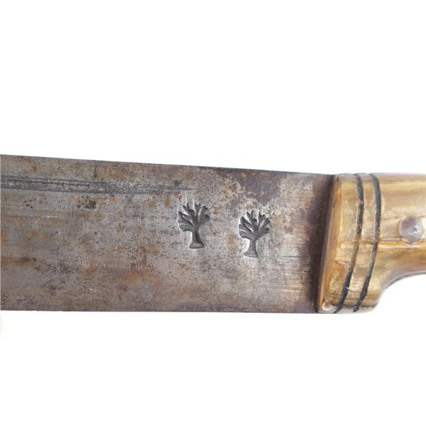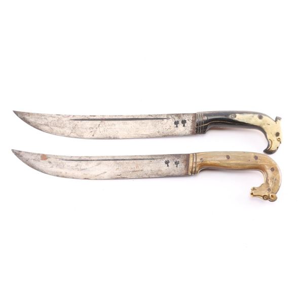 Measure 13 1/2" total with 8 1/2" maker marked blades. Handles carved of antler and deer horn.