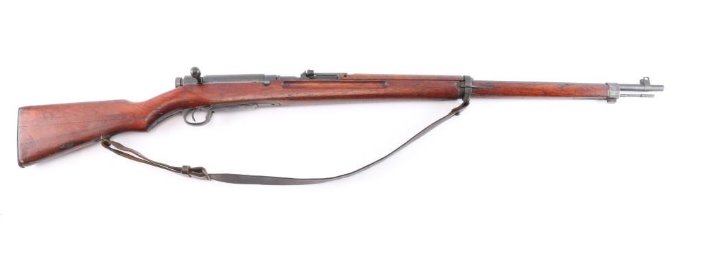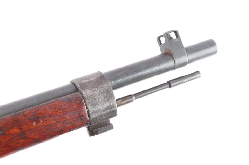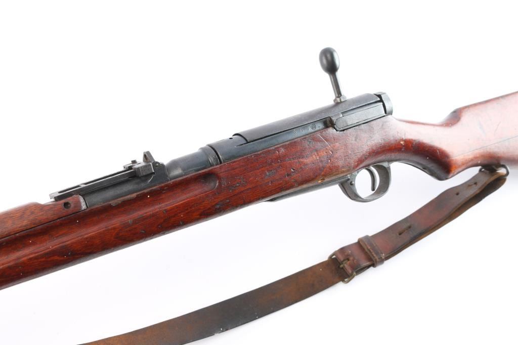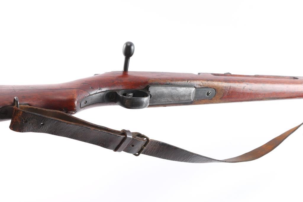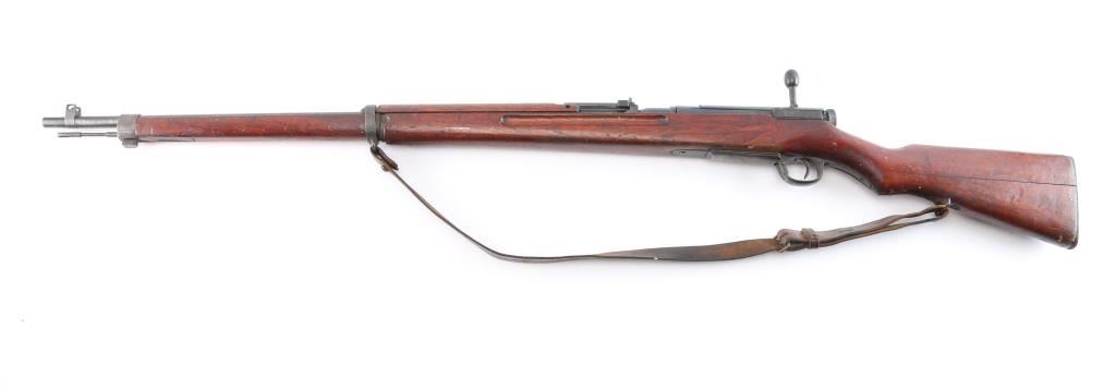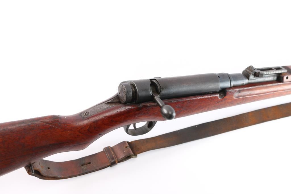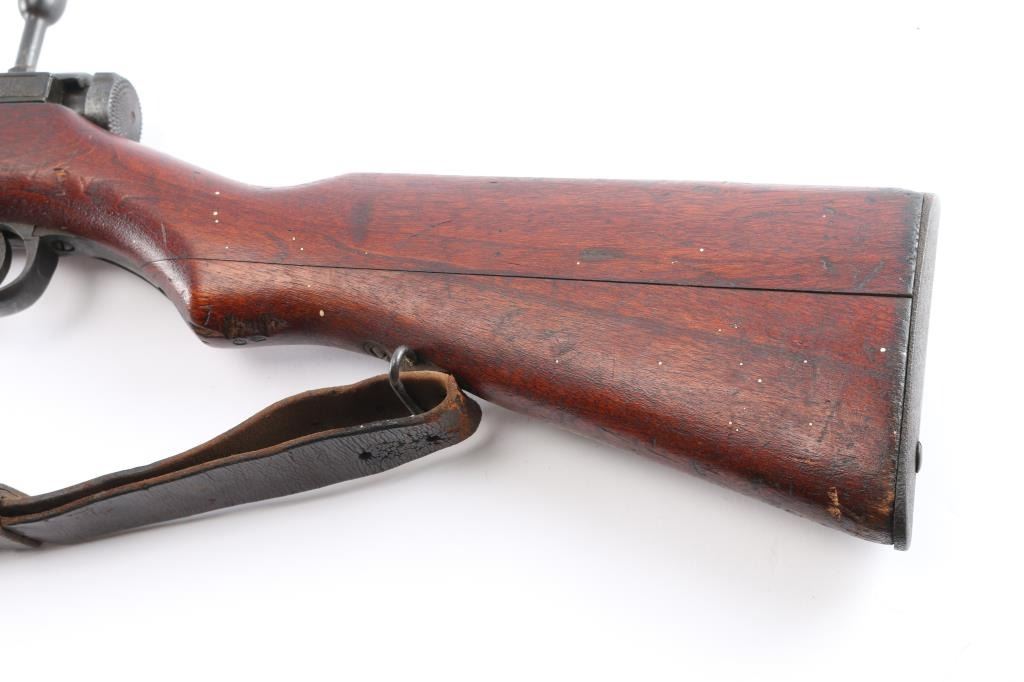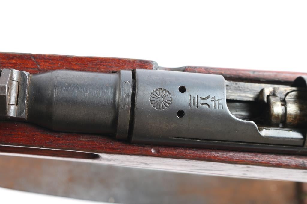Mukden Arsenal (Manchuria) 'Arisaka' Japanese military bolt action long rifle, 3 digit serial number,manufactured at Mukden 1937-44. Full Chrysanthemum over "Type 38". A Japanese Type 38 Arisaka rifle with a three-digit serial number manufactured at the Mukden Arsenal is a relatively rare find. The Mukden Arsenal, also known as the Hoten Arsenal, was established in Manchuria (modern-day Shenyang, China) during the Japanese occupation. Rifles produced there are considered more scarce than those made in Japan. Features blued finish, wood stock with finger grooves & curved grip, wood handguard, 31" barrel, blade front sight, folding ladder rear sight with "V" notch, floorplate release button inside triggerguard, cleaning rod under barrel, bayonet lug. Bore is dark/rough with rifling present. Retains about 70% blued finish, dulled somewhat, markings are crisp/clear. Wood is very good/sound with specks of white paint. Serial numbers 337 on receiver, matching serial "09 ending a symbol in what looks like a squared "C" on the bolt, dust cover. and bayonet lug. original brown leather sling attached. No import marks, vet bring back.
