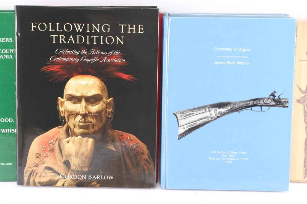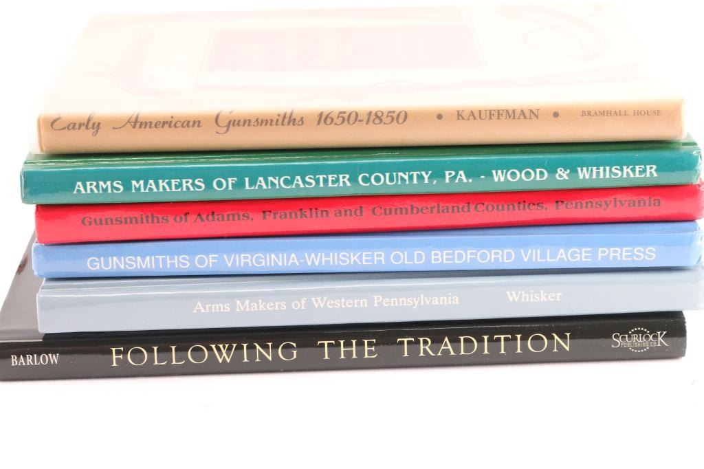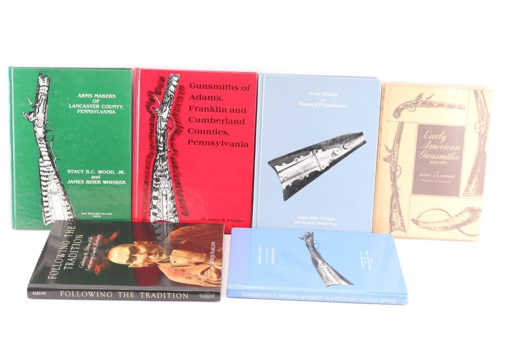 Includes: Following the Tradition Celebrating the Artisans of the Contemporary Longrifle Association (copyright 2007) signed by the author, Gordon Barlow to Joseph Alphabet, excellent condition; Early American Gunsmiths 1650-1850 (copyright 1952) by Henry J. Kauffman, good condition; Gunsmiths of Virginia (copyright 1992) by James Biser Whisker, good condition; Arms Makers of Western Pennsylvania (copyright 1994) by James Biser Whisker, very good to excellent condition; Arms Makers of Lancaster County, Pennsylvania (copyright 1991) by Stacy B.C. Wood Jr. & James B. Whisker, good condition; Gunsmiths of Adams, Franklin and Cumberland Counties, Pennsylvania (copyright 1989) by James B. Whisker, very good to excellent condition.