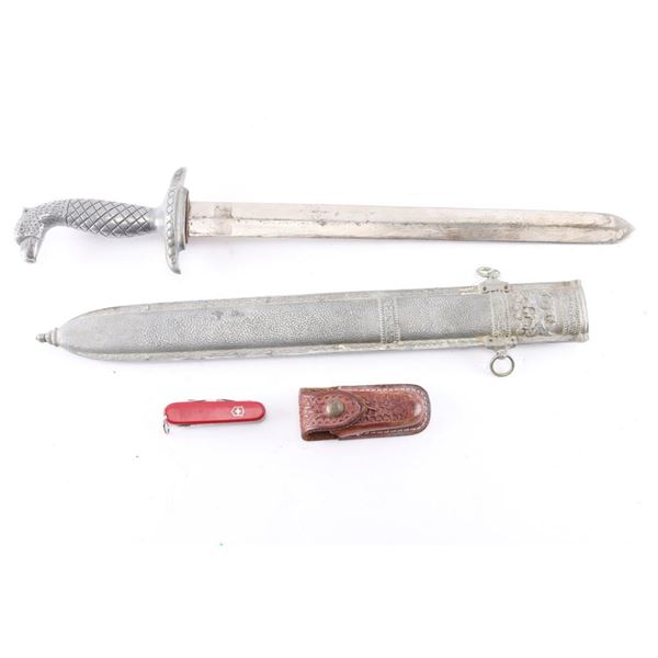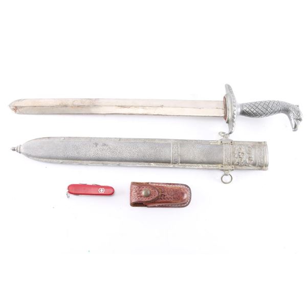 Vintage copy of a ancient short sword. made in the style of a Gladius Eagle of Rome sword but has images of the Greek Gods Hermes and Athena on the two ring scabbard. Pewter pommel and scabbard, 17 1/2" nickeled blade. Blade marked with makers name, appears to be Italian but can't make in out. Antique as the sword and leather washer show a lot of age, probablely Victorian era. Overall very good condition with signs of light sharpening and scuffs to the blade. also included is a Victorinox Swiss Army Knife. multi-tool with tooled brown leather belt pouch, very good condition.