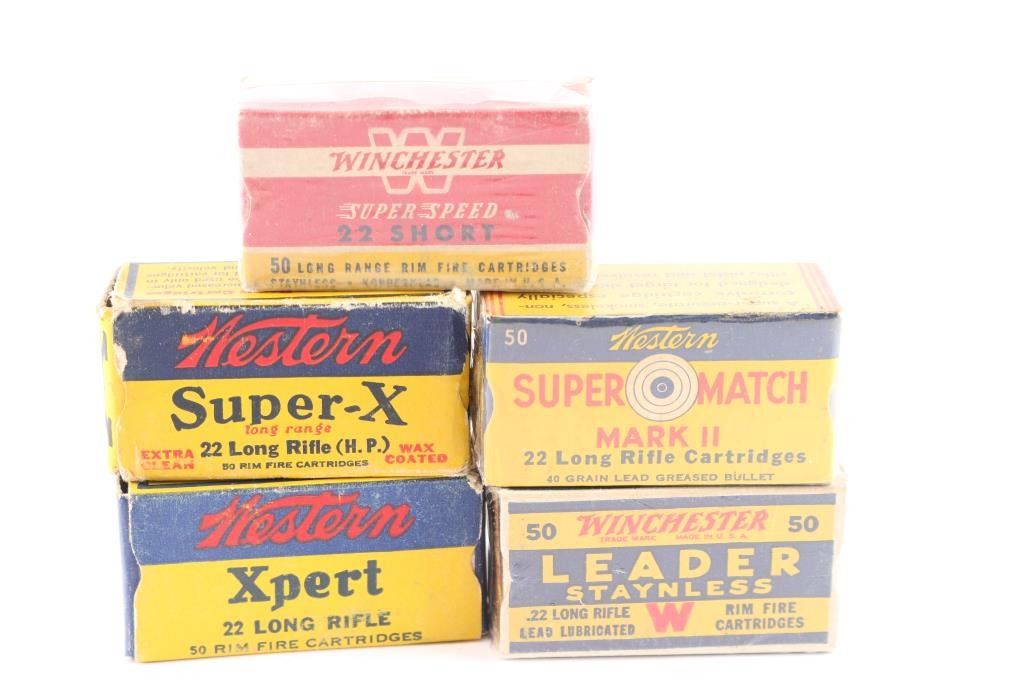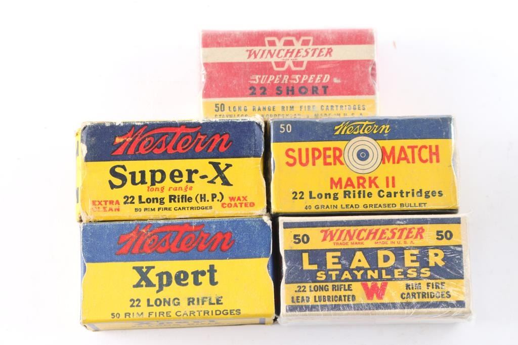 Includes: 5 boxes of .22 cal collectible cartridges by Winchester or Western. (A) Super Match .22 LR target illustration opened full. Near fine. (B) Winchester .22 LR "Leader" Staynless. Opened full box. V.G. condition.(C) .22 Short Winchester Super Speed. Good condition. Full box. (D) ""Xpert" Western .22 LR. In very good to near fine condition. Opened full box. (E) Super-X .22 LR opened full box. Good condition.