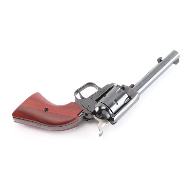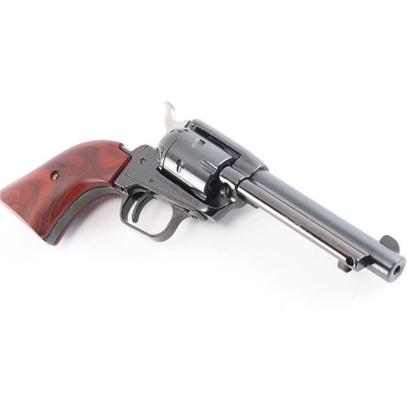American made Single Action 6-Shot Revolver chambered for .22 caliber ammuntion and comes with fluted .22LR cylinder. Features a black oxide finish, 4.8" barrel and frame, fixed blade front sight, integral square notched rear sight, safety on the left side of the hammer with checkered trigger spur and two piece Cocobolo grips. Retains 95% finish with scattered scratches. Wood grips are fine. Bore looks very good/slightly dirty. Condition is NRA very good. ***Modern Firearm***.