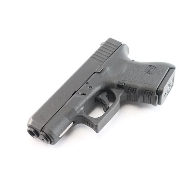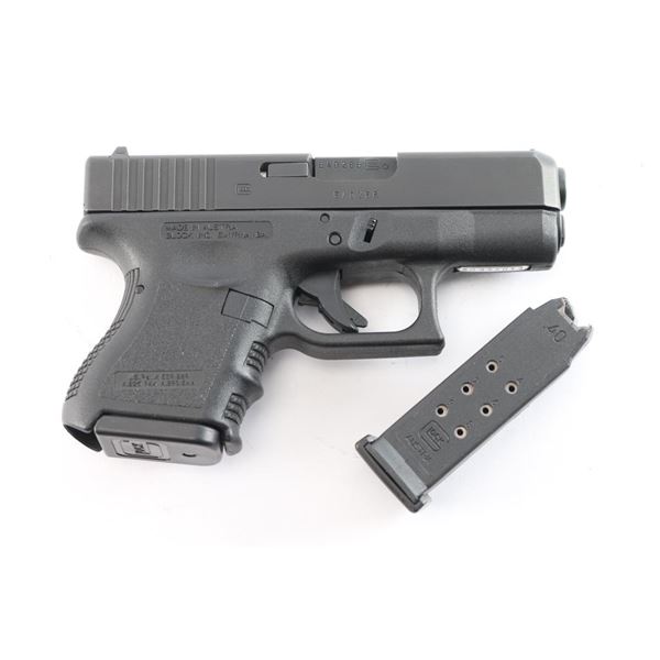 Austrian made safe-action semi-automatic sub-compact pistol chambered in 40 S&W. Features a matte black finish, 3.3" barrel, factory sights, trigger safety, push button magazine release and durable black polymer frame with integral textured finger groove grip. The barrel, slide & frame show matching serial numbers. Includes a factory 'Tupperware' black plastic case with two 9rd magazines, cleaning brush/rod and mag loader. Pistol exhibits approximately 98% showing little to no wear. Action is crisp, bore is excellent/bright.