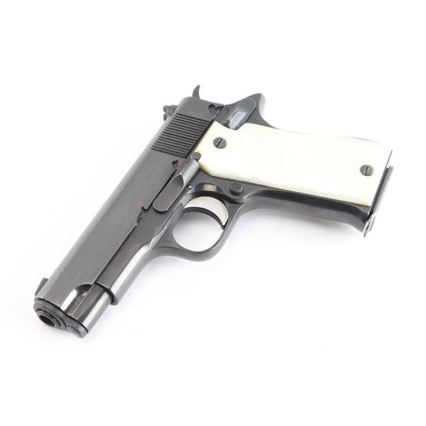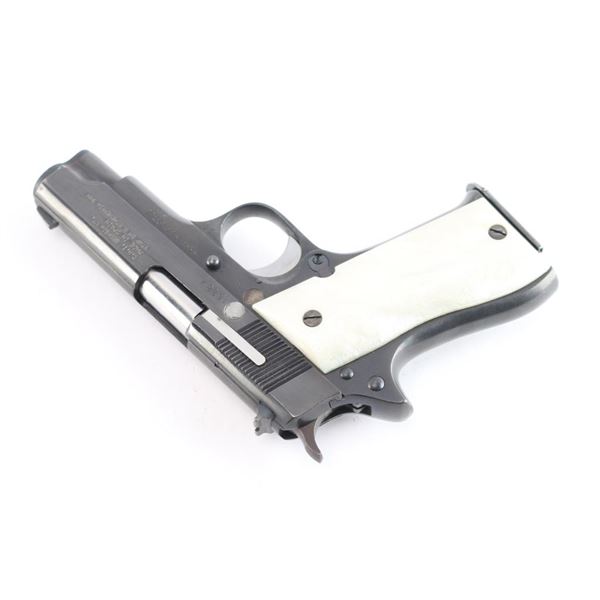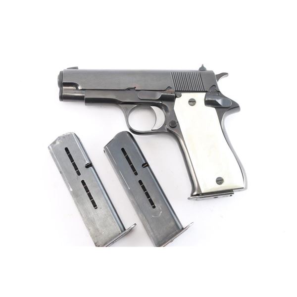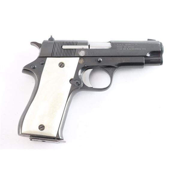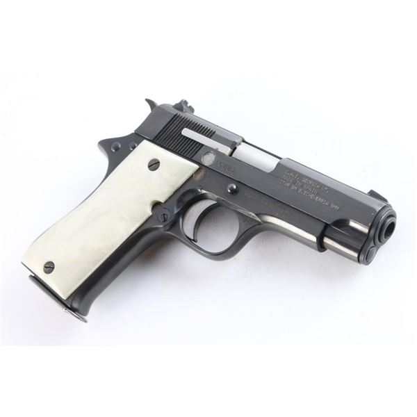 The Star Model BM is a single-action semi-automatic pistol that fires the 9X19mm. It was produced by Star Bonifacio Echeverria, S.A. in Spain and is a compact version of the full size Star Model B, manufactured circa 1976. Imported by C.A.I. of Georgia, V.T. with import marks and serial number on the right side of the slide and frame. Features a reblued finish, 3.75" barrel, full-length steel guide rod, blade front sight, dovetailed rear sight with square notch, serrated trigger, knurled hammer spur, thumb safety on the left side of the frame, push button magazine release, steel frame and smooth simulated 'Mother of Pearl' grips. Bore is good/slightly dirty. Retains approx. 95% reblue with minor edge wear, scattered scratches and pin prick pitting under the finish. Grips are excellent. Original serial numbers are matching. Comes three 8rd magazines. Condition is NRA good to Very Good. ***Modern Firearm***.