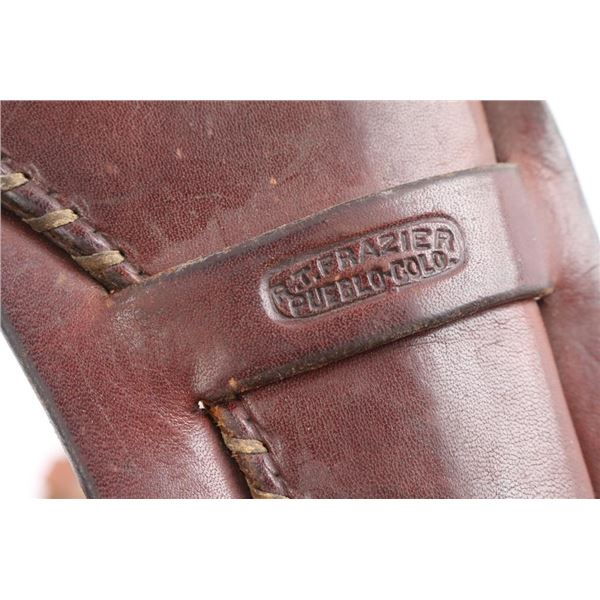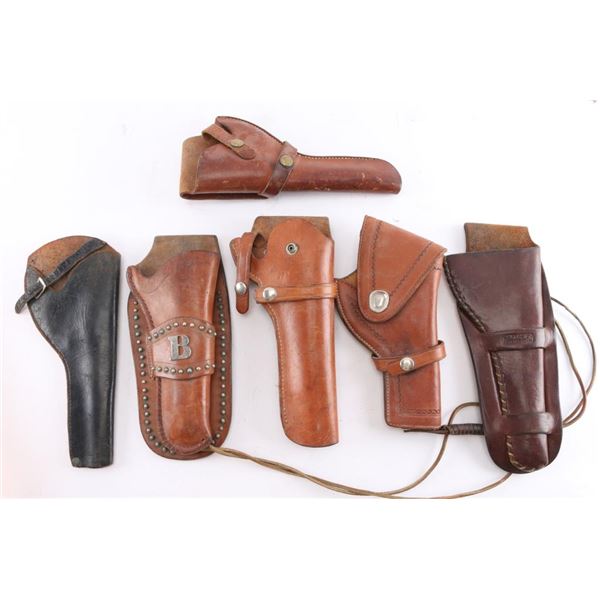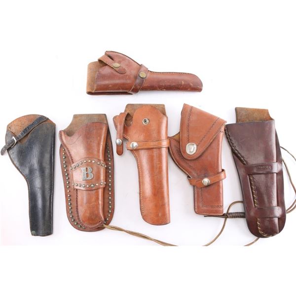(4) leather, right-hand holsters. (1) Left-hand leather holster. (1) T. Frazier double loop, right-hand holster.