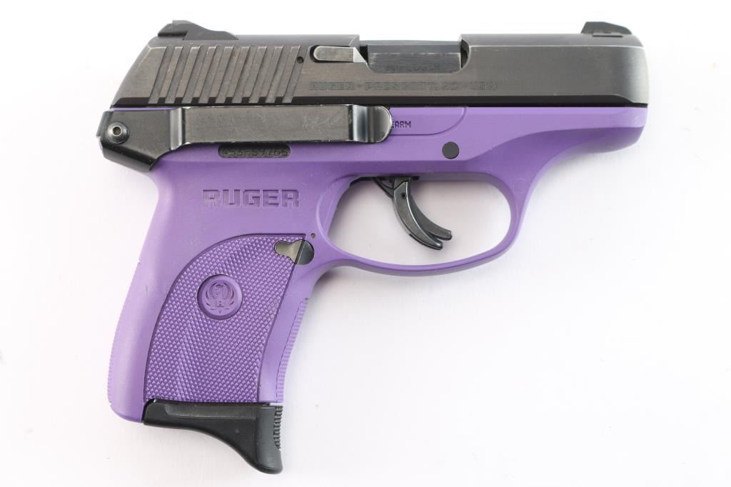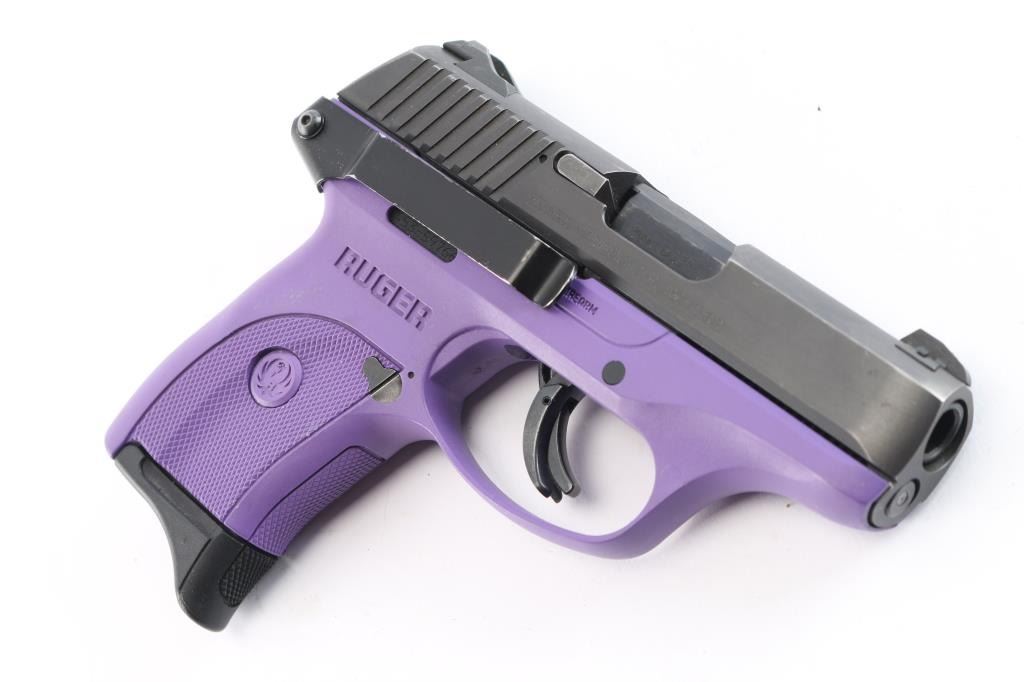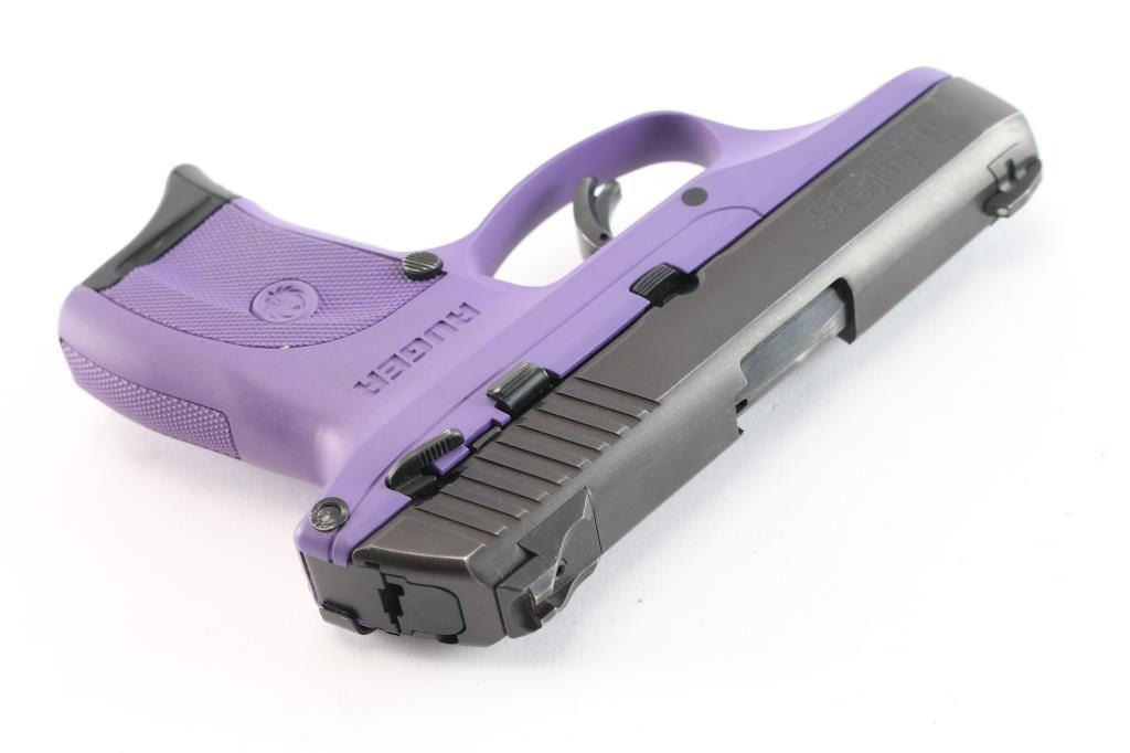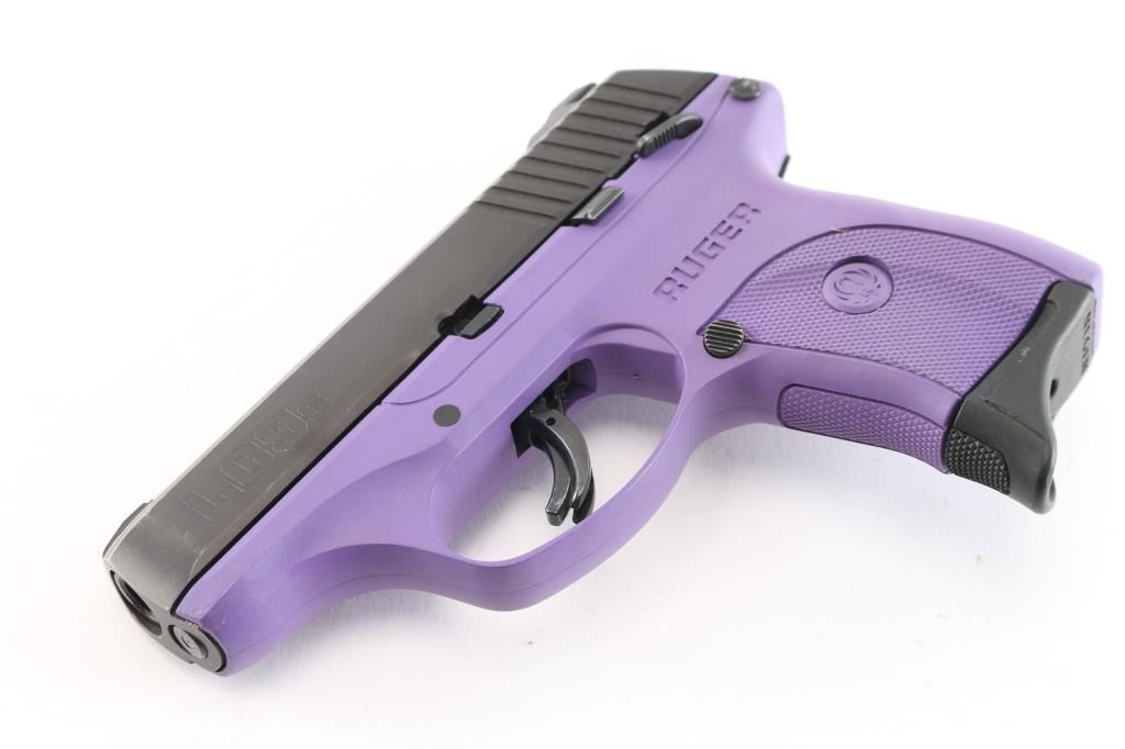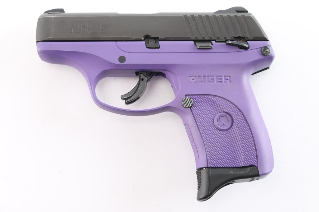 'Lightweight Compact 9mm Striker-fired' Now discontinued, striker fired semi-automatic compact pistol chambered in 9x19mm, manufactured in Prescott, AZ in 2017. Features a matte blued slide, 3 3/16" barrel, dovetailed blade front sight with white dot, drift adjustable two-dot rear sight with set screw, safety trigger with crisp pull, manual safety on the left side of the frame, magazine disconnect safety, push button magazine release, factory 7 round magazine with finger rest floorplate, and a 'Lady Lilac' purple glass-filled nylon frame with integral checkered grip panels. belt clip installed on the right frame. Pistol exhibits little signs of use with some slight edge wear. Action is crisp, the bore is excellent/bright and the polymer is excellent.