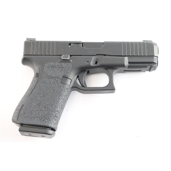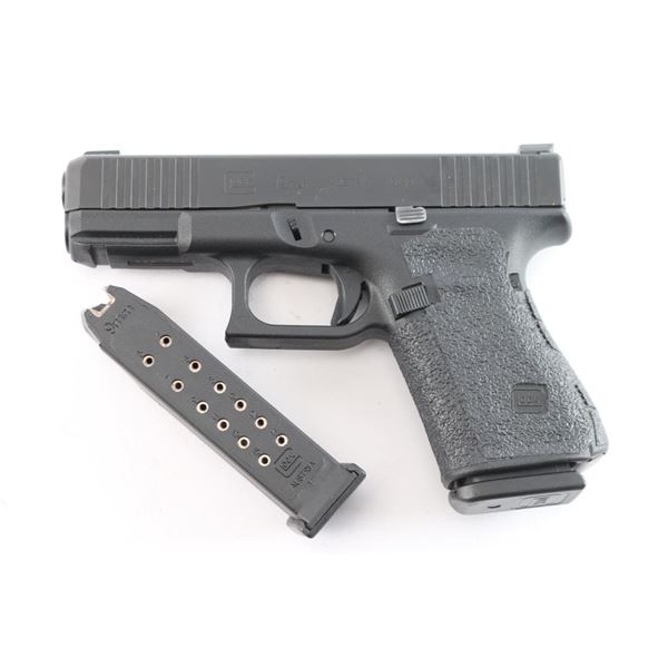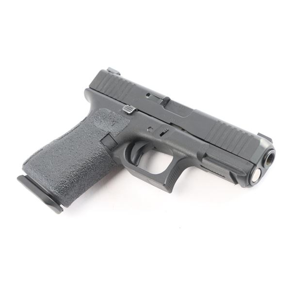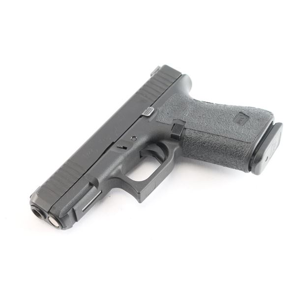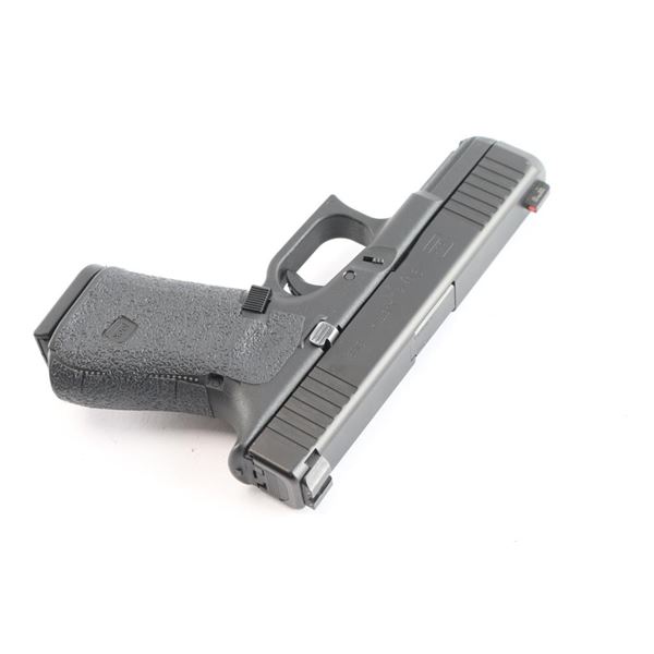 Austrian semiautomatic pistol, imported by Glock Inc, Smyrna GA. Features approx 4" barrel, Ameriglo H3 night sights, striker fired, manual safety in trigger, replaceable backstrap inserts with different size & shape, accessory rail on dust cover. All black finish, safety trigger, 15 rd factory magazine. The grip has been covered with non-slip adhesive textured tape. Bore is excellent/bright. Overall external condition is like new, with little evidence of handling. Includes original "Red Label" factory plastic carry case, manual, spare 15 round magazine (2) total, cleaning rod and four different backstrap inserts.