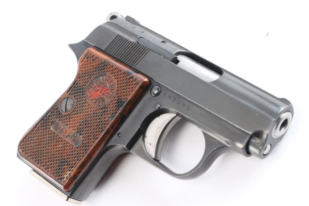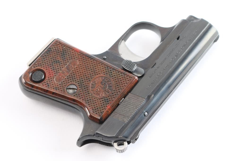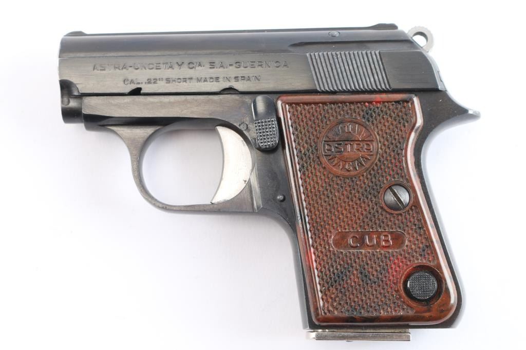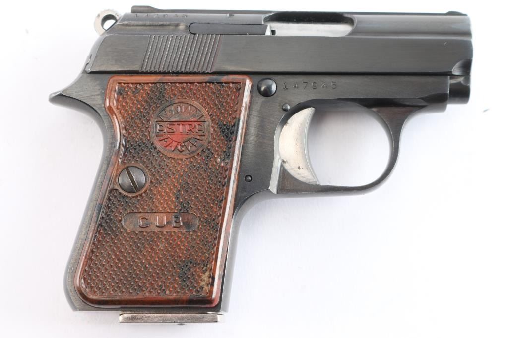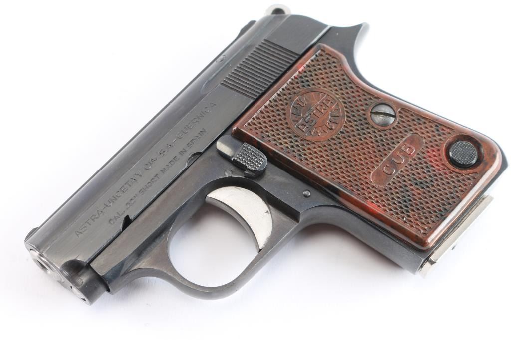 Vintage single action semi-automatic pocket pistol chambered in .22 Short. Manufactured in Spain circa 1966. Features a blued finish, 2.25” barrel, full-length steel guide rod, fixed sights, smooth trigger, serrated round hammer spur, manual safety/slide catch on the left side of the frame, push button magazine release, 6 round magazine, steel frame and checkered faux-wood synthetic grips with molded “CUB” & Astra insignias. Matching serial numbers are found on the frame & slide. Pistol retains approximately 98% of its original finish showing minor edge wear and handling marks. The action is mechanically sound, the bore is excellent, and the synthetic grips are excellent.