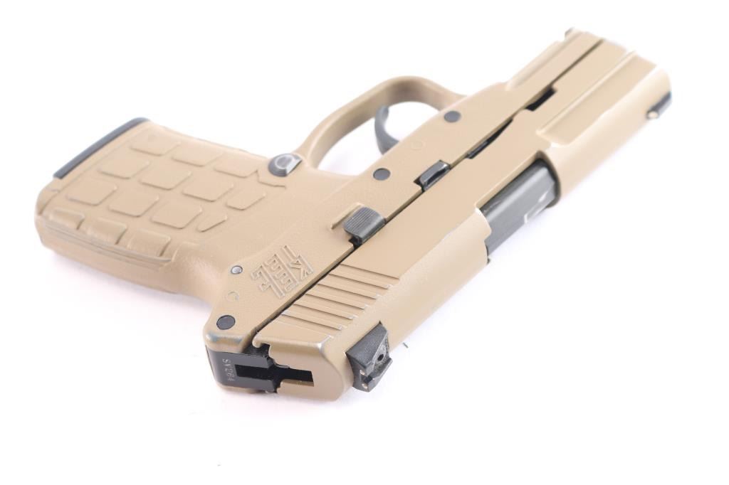 Compact semiautomatic pistol chambered for 9x19mm Luger. Features 3" barrel, adjustable 3 dot sights, double action only type trigger, desert finished slide, polymer frame, blued barrel, full length guide rod. 7 rd factory magazine. Bore is excellent. Metal finish is 96% with edge wear and a couple of minor scuffs on the frame. Includes factory storage box with trigger lock, manual, spare 7 rd magazine with finger rest base plate. (2) total.