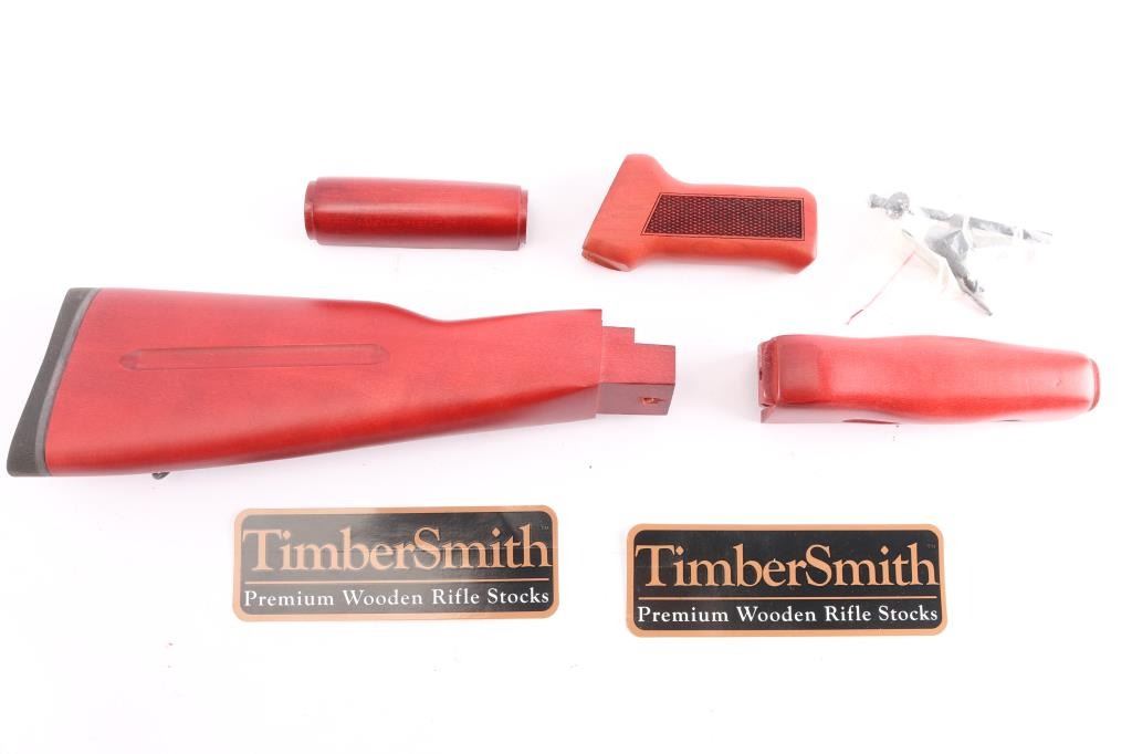 TimberSmith Premium Red Laminate Romanian AK-47 Stock Set. Standard set upgraded with a precision fit recoil absorbing rubber buttpad, a checkered patterned pistol grip, and a lightening cut on the stock and handguard. Colored in the highly sought after Russian Red, on laminate. Made in the U.S. New in box with paperwork, screws, plates and drill bit.