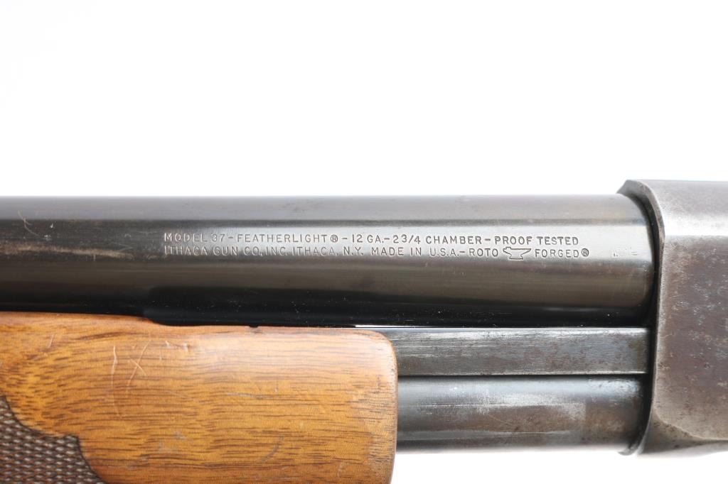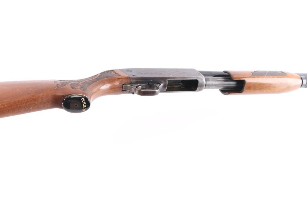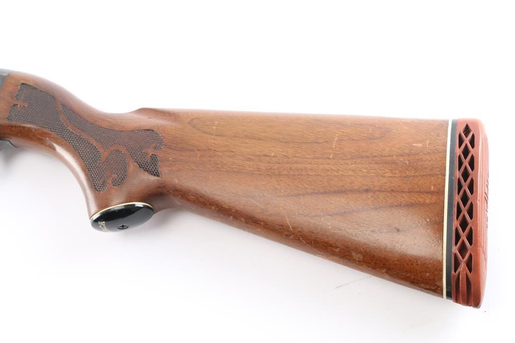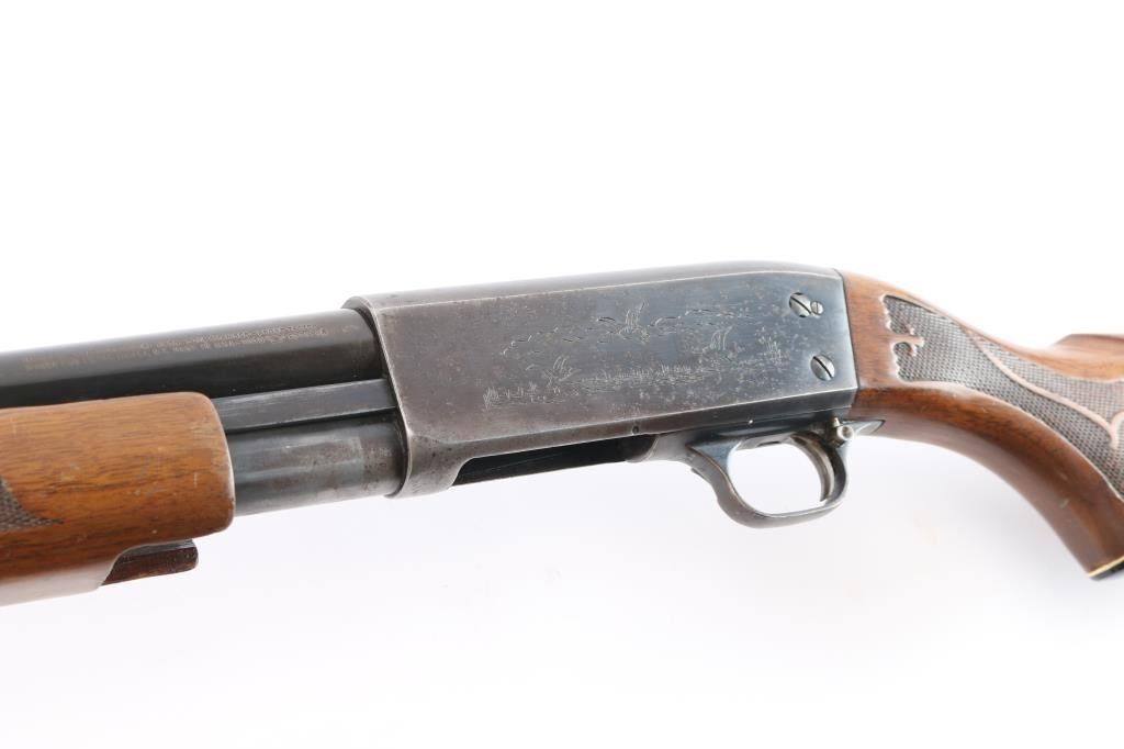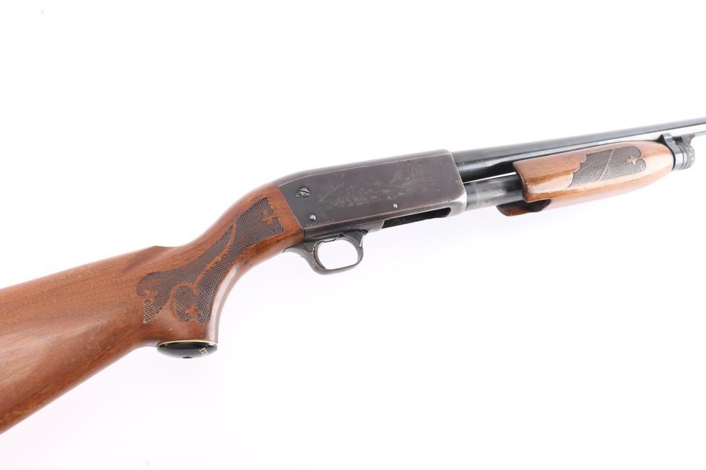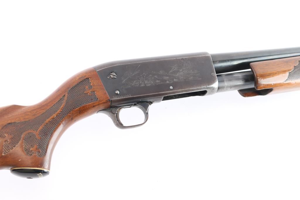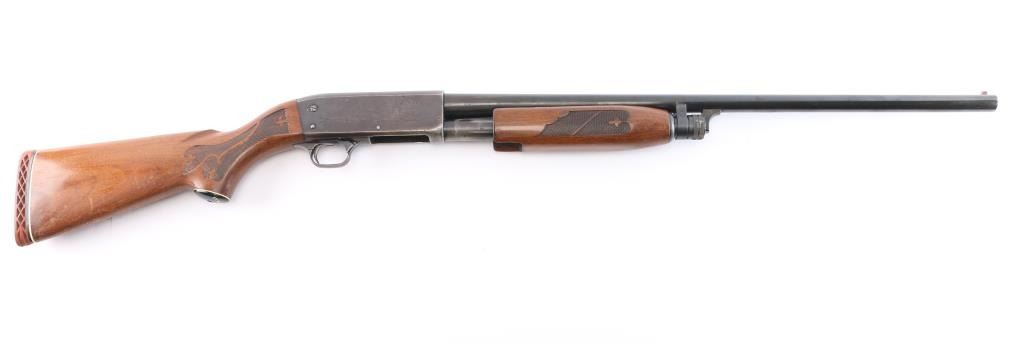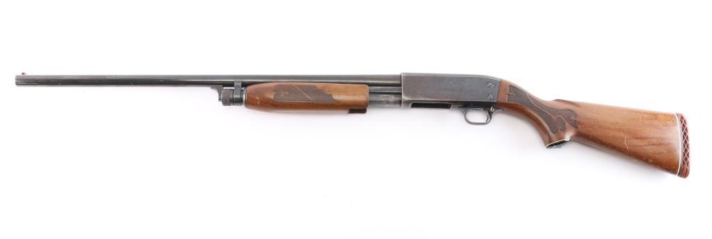 'Featherweight' slide-action 12 Gauge shotgun for 2 3/4" shotshells. Circa 1969. Features a 26" barrel with a Cylinder choke, orange fiber-optic front sight , no rear sight. Fed from a 5-rd tube magazine. Action is crisp/tight. Thumb safety on rear triggerguard. Blued steel. Checkered floral walnut stock and forearm w/black grip cap. Dog/waterfowl scenes roll stamped on both sides of receiver. Red vented recoil pad. Bore appears very good. Retains approx. 50% finish with heavy wear, pin prick pitting on receiver. Wood has dulled finish with some scratches, dents and wear. LOP is 14". NRA Condition is good. ***C&R Firearm***.