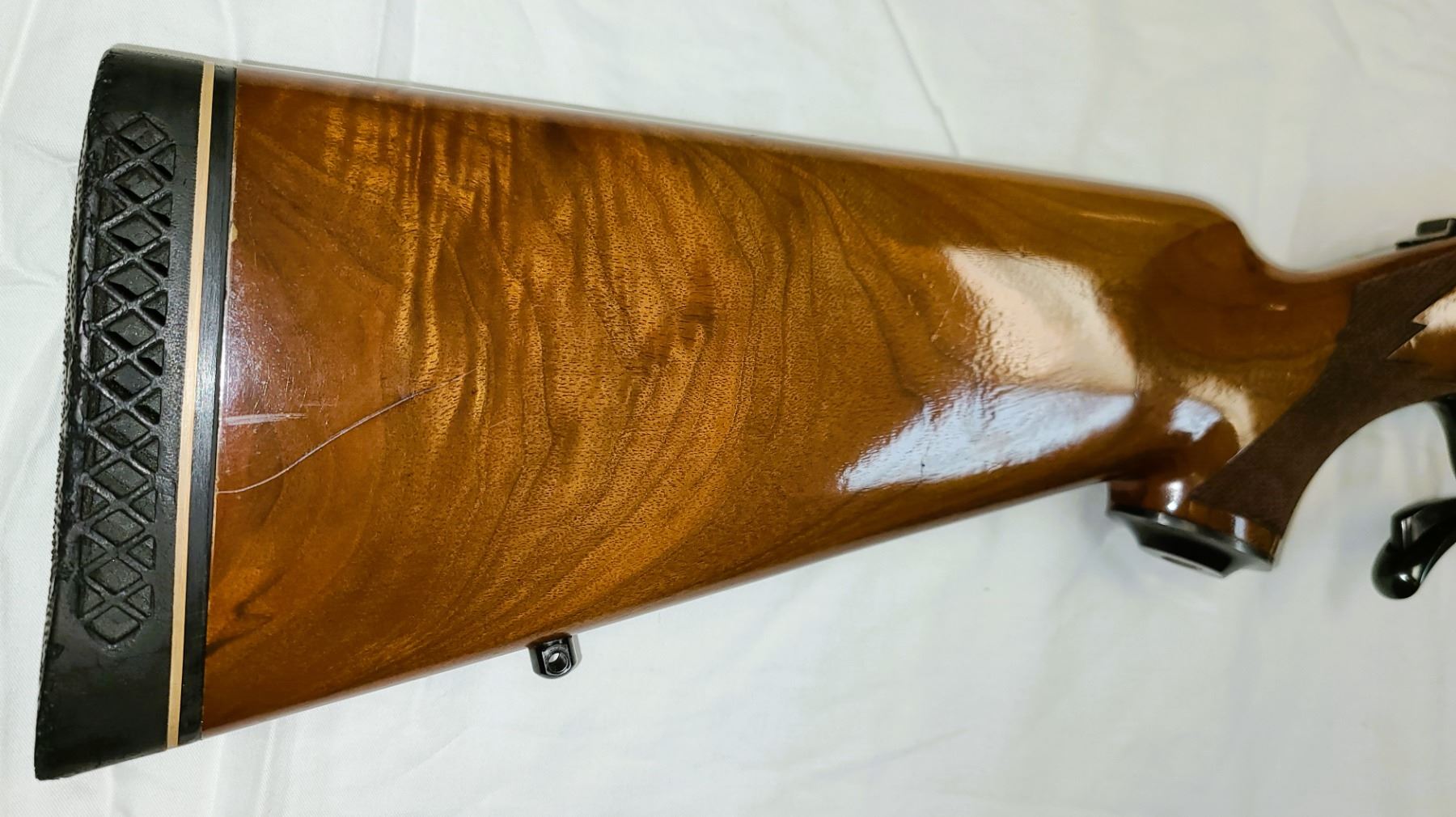 Does have one scratch and rub near rubber butt pad on right hand side of rear stock.