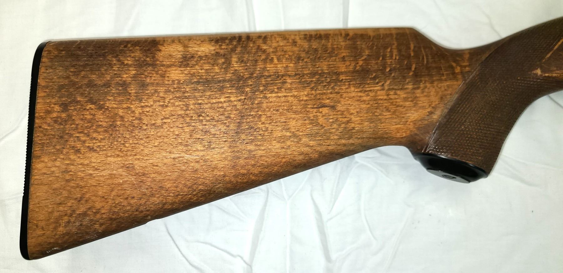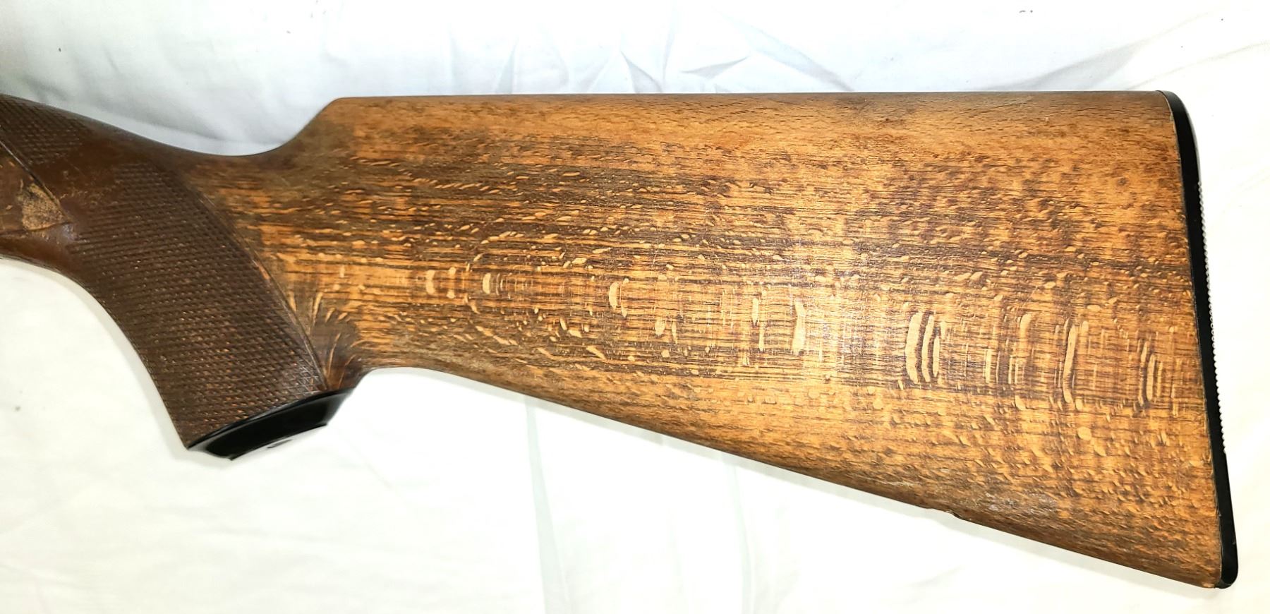 Has a few cracks on left side of rear stock and has been sanded and refinished.