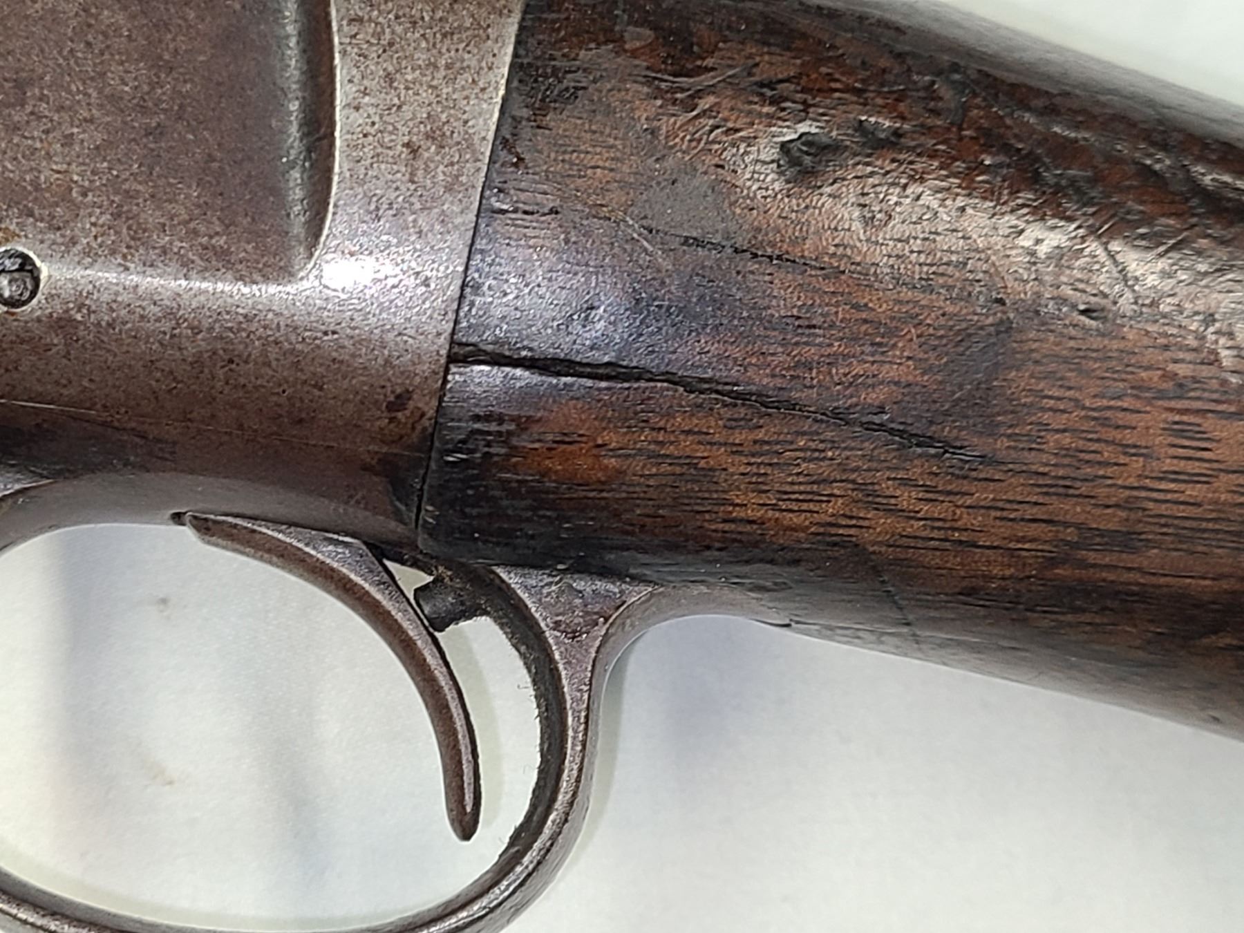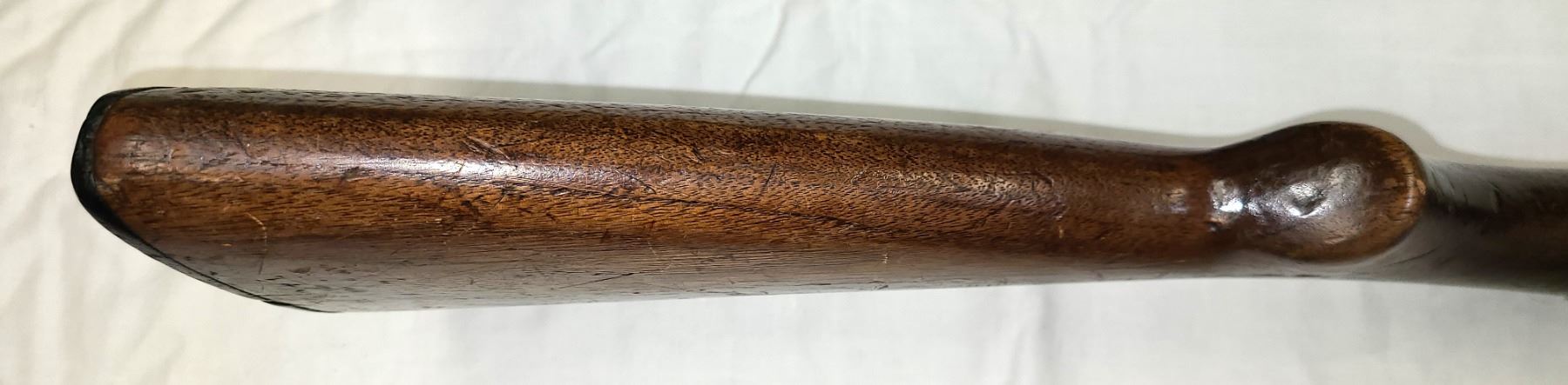 Wood stock has many dents and scratches plus a long crack running from butt