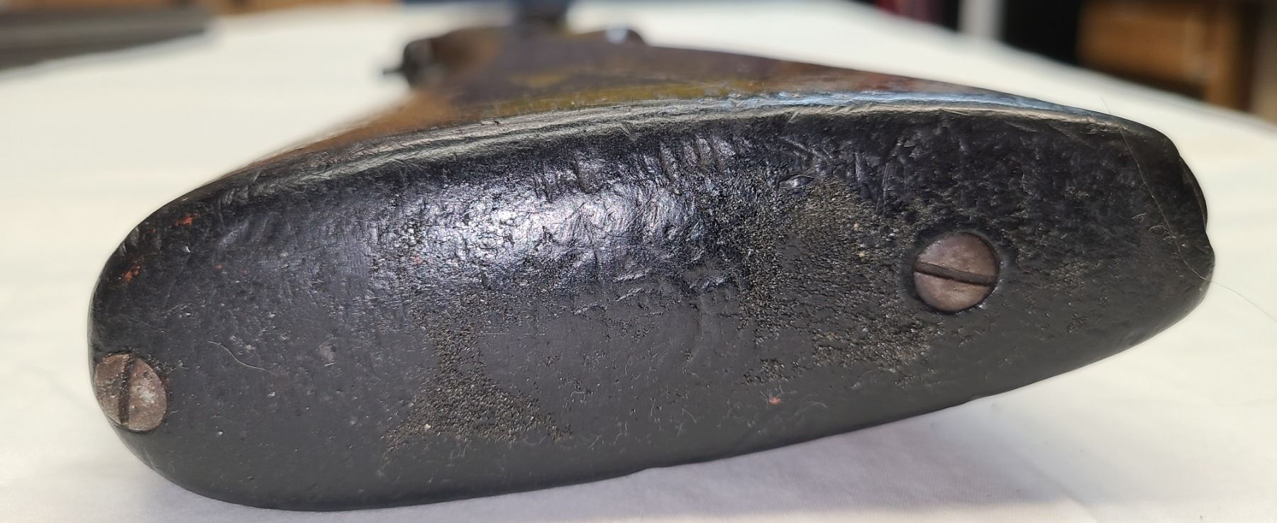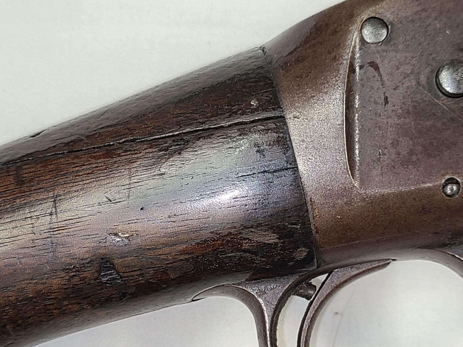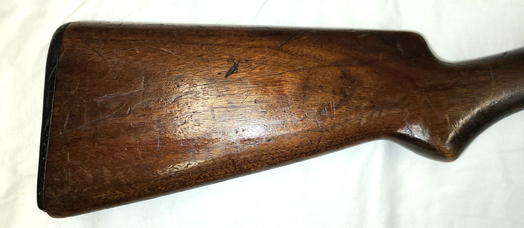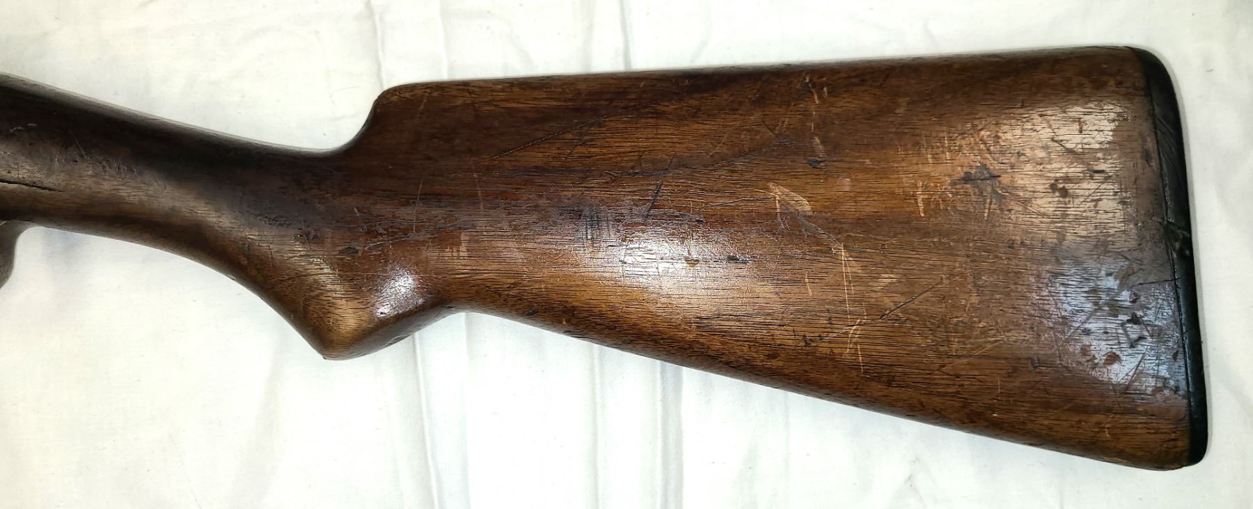 Has the original Winchester butt plate which is very worn and ghas a few chips along