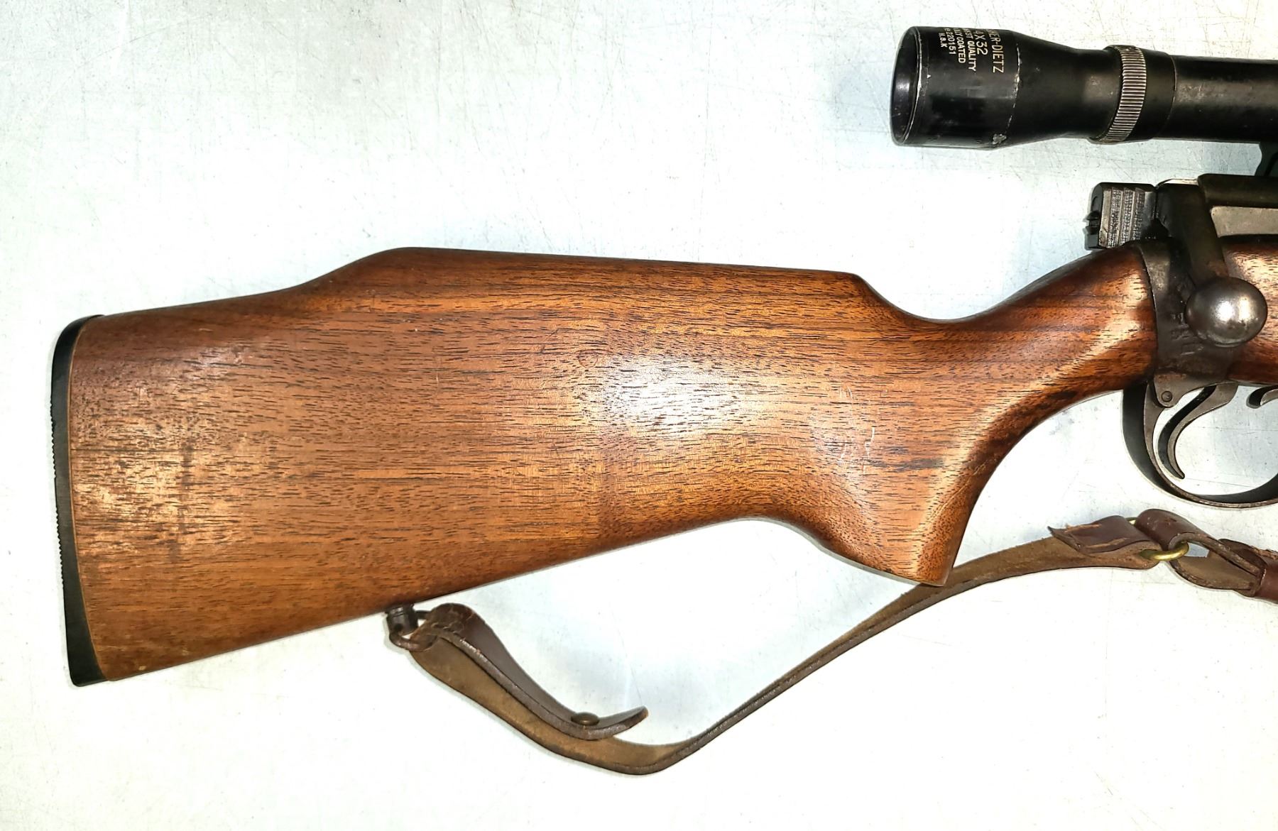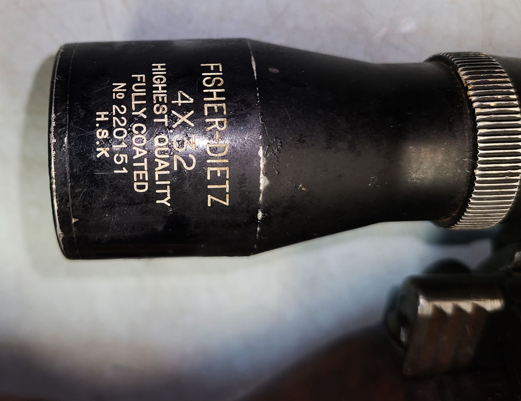 Comes with a Fisher-Dietz 4x32 Vintage Scope on one peice rail side mounted rail.